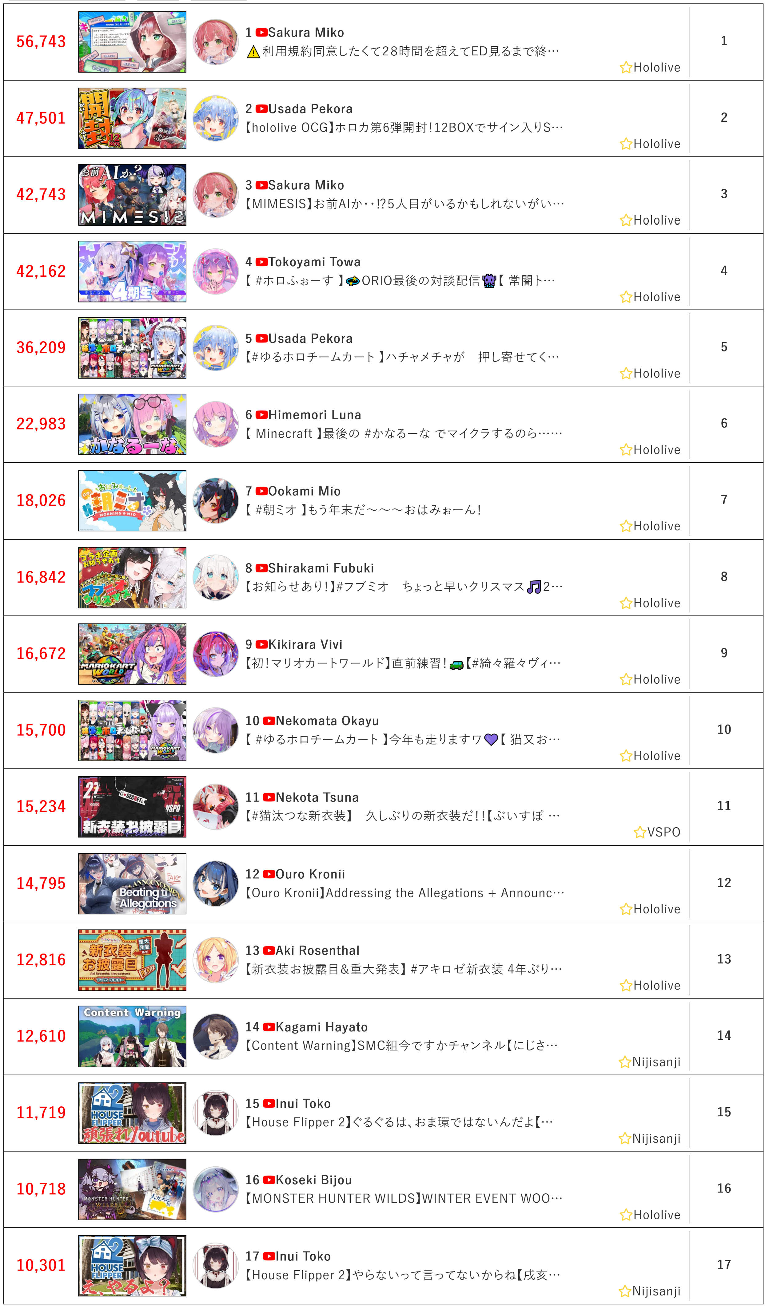 >>107914967DEC 2025 EN SILVER12/1 - Nimi - Dispatch: 11,83812/2 - Luca - Elden Ring Shadow of the Erdtree: 16,75012/3 - Seible - Valorant: 10,56012/4 - Nimi - Dispatch: 11,58012/5 - Seible - Pokemon Legends ZA: 9,69112/6 - Bijou - Elden Ring The Forsaken Hollows: 13,20812/7 - Bijou - Elden Ring The Forsaken Hollows: 9,32812/8 - Calliope - DBZ Kakarot: 11,45312/9 - Cecilia - Resident Evil 6: 10,25012/10 - Shiori - Grandblue Fantasy Versus: 13,38612/11 - Kronii - Powerwash Simulator 2: 11,23712/12 - Ina'nis - Zatsu: 10,87312/13 - Calliope - Sekiro Shadows Die Twice: 15,49112/14 - Meloco - Stardew Valley: 9,06812/15 - Calliope - Dragon Ball Z Kakarot: 13,89112/16 - Ina'nis - Monster Hunter Wilds + Outfit Reveal: 14,04612/17 - Aia - Divinity Original Sin 2: 11,04212/18 - Bijou - Honkai Star Rail: 11,07112/19 - Baelz - Dispatch: 8,30512/20 - Kronii - Lorelei and the Laser Eyes: 8,22512/21 - Kaelix - Stardew Valley: 9,06112/22 - Bijou - Monster Hunter Wilds: 10,669PER COMPANY12x: Hololive English6x: Nijisanji English2x: IndiePER STREAMER3x: Bijou2x: Ina'nis, Calliope, Kronii, Nimi, Seible1x: Baelz, Shiori, Luca, Meloco, Aia, Kaelix