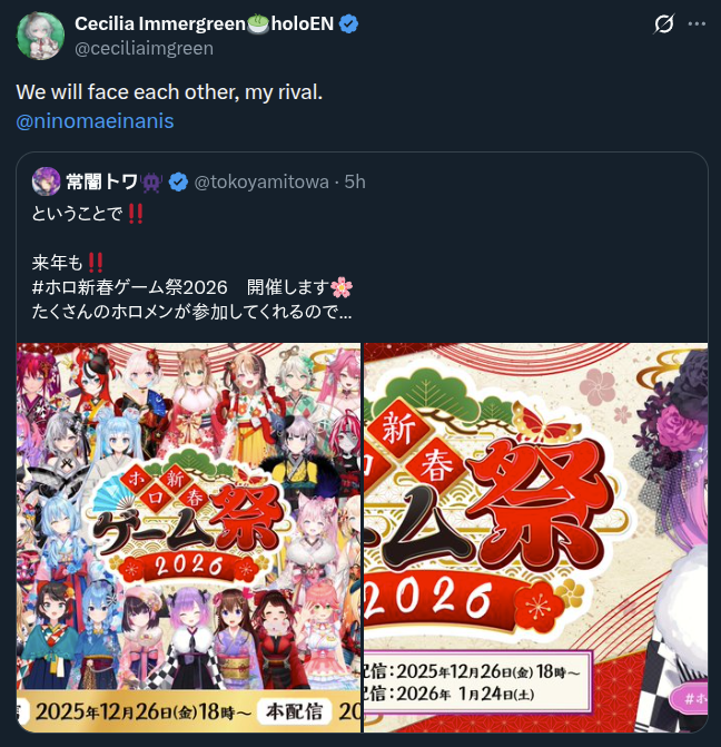 >>107914933DEC 2025 EN GOLD12/1 - Calliope - Dragon Ball Z Kakarot: 20,06812/2 - Calliope - Sekiro Shadows Die Twice: 27,48712/3 - Bijou - Dead Space 3: 10,93612/4 - Kaelix - Zatsu: 12,11212/5 - Calliope - Dragon Ball Z Kakarot: 21,41612/6 - FUWAMOCO - Kanji Learning: 17,92812/7 - IRyS - No, I'm Not Human: 15,43912/8 - Bijou - Batman Arkham City: 11,98012/9 - IRyS - Routine: 12,69212/10 - Bijou - Call of Duty Modern Warfare 2: 26,08712/11 - Gigi - The Elder Scrolls IV Oblivion Remastered: 11,57912/12 - Bijou - The Game Awards Watchalong: 28,60012/13 - IRyS - Routine: 64,65012/14 - Bijou - PEAK: 13,51112/15 - FUWAMOCO - Offcollab Karaoke: 28,28912/16 - IRyS - Dispatch: 18,15212/17 - Bijou - Karaoke Practice: 11,90312/18 - IRyS - Dispatch: 16,84912/19 - Kronii - Dispatch: 12,43312/20 - Bijou - Warframe: 8,95012/21 - IRyS - Grand Turismo 7 Watchalong: 11,02612/22 - Kronii - Petplay Allegations: 14,795PER COMPANY21x: Hololive English1x: Nijisanji EnglishHOLOLIVE ENGLISH WINS ALL 12 MONTHS OF THE YEAR FOR THE SECOND YEAR IN A ROW.HOLOLIVE ENGLISH COMPLETES A STREAK OF 18 CONSECUTIVE DAILY GOLDS WON, THEIR BIGGEST STREAK IN 2025.IRyS (Hololive English Promise) breaks her record of most gold medals won on a single month, her record used to be 5 on May 2023.PER STREAMER7x: Bijou6x: IRyS3x: Calliope2x: FUWAMOCO, Kronii1x: Gigi, Kaelix