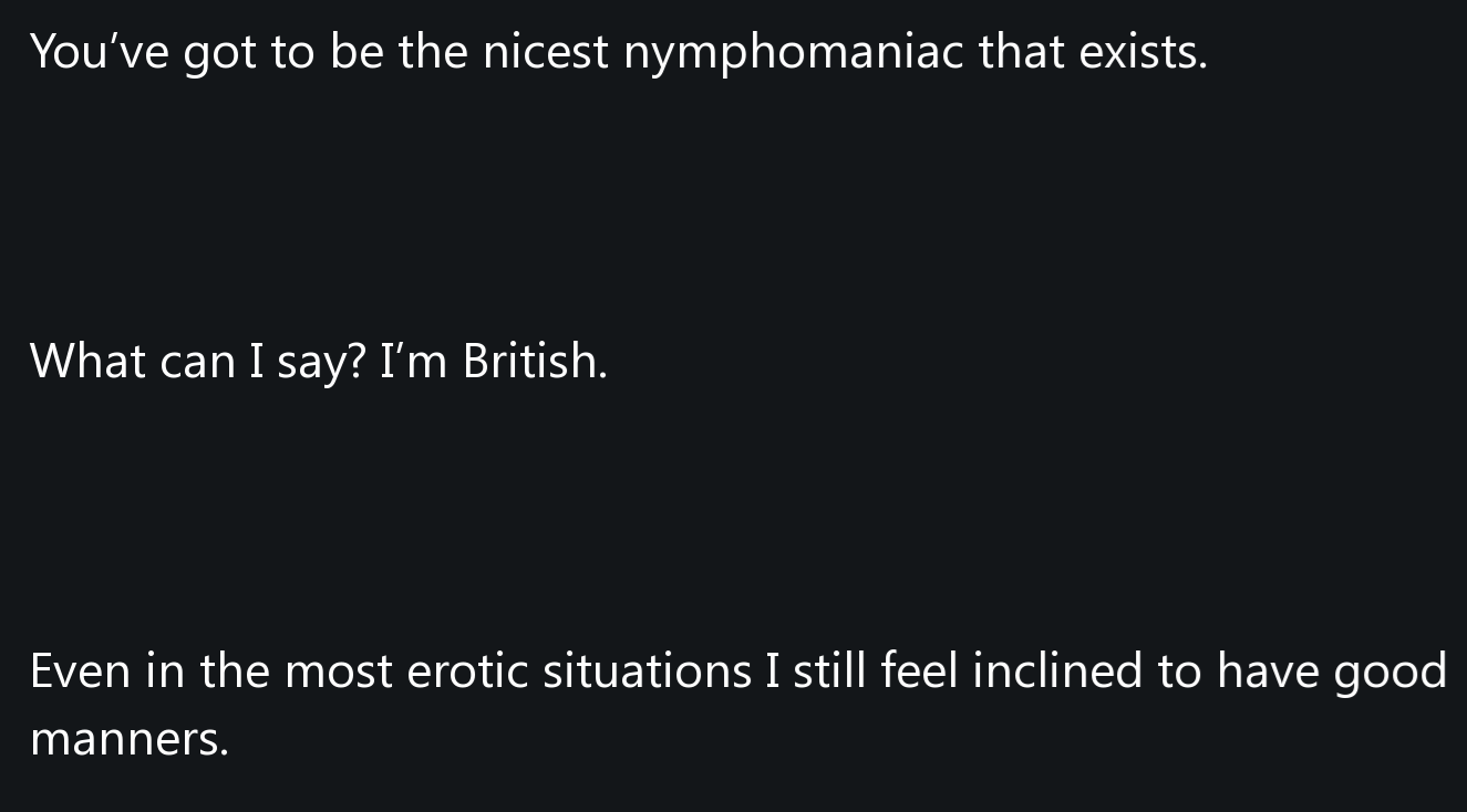 >>107914502I have no fucking idea and at the same time I have no fucking idea why is she happy nowMaybe estrogen overdose or something, or her Aerith chatbot malfunctioned I don't know