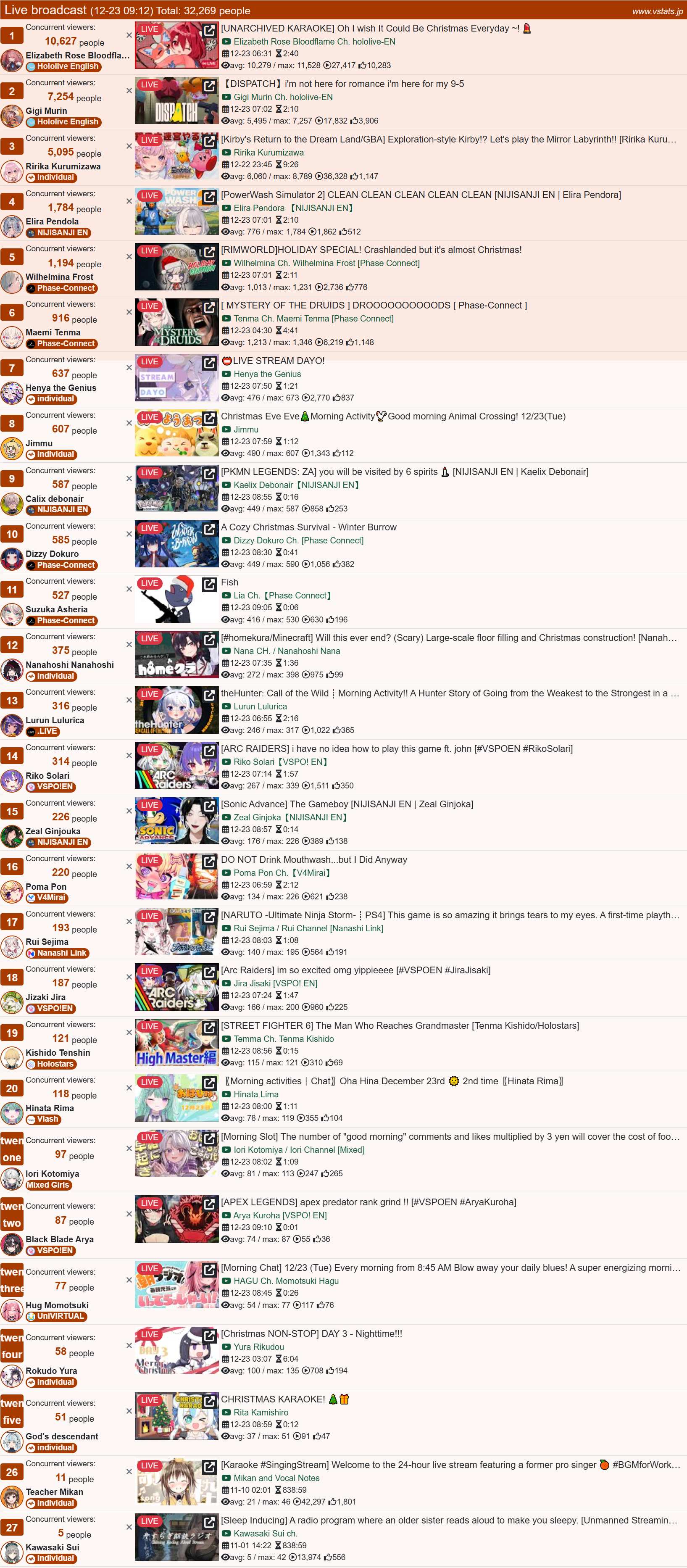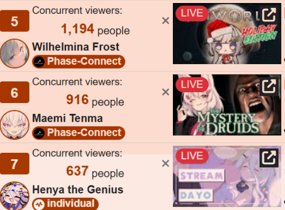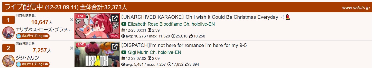 >>107914995DEC 2025 EN BRONZE12/1 - Wilson - Minecraft: 9,70312/2 - Wilson - Minecraft: 13,44512/3 - Calliope - Sekiro Shadows Die Twice: 10,49812/4 - Freodore - Elden Ring Nightreign: 11,56212/5 - Kaelix - Animal Crossing: 9,69112/6 - Seible - Work Stream: 10,09512/7 - Seible - Valorant: 7,56112/8 - Cecilia - Expedition 33: 8,67812/9 - Filian - Minecraft: 7,19512/10 - Gigi - Honkai Star Rail: 6,76612/11 - Kiara - Arknights Endfield: 10,80312/12 - Nimi - The Game Awards Watchalong: 10,83812/13 - Gigi - Grandblue Fantasy Versus: 14,18212/14 - Nimi - Vampire the Masquerade: 9,06812/15 - Bijou - Expedition 33: 7,48012/16 - Bijou - Monster Hunter Wilds + Outfit Reveal: 9,44512/17 - Kaelix - Animal Crossing: 10,72512/18 - Nimi - Hitman: 7,45812/19 - Gigi - Honkai Star Rail: 7,55012/20 - Shu - Outfit Reveal + Anniversary Stream: 7,72512/21 - Gigi - The Elder Scrolls IV Oblivion Remastered: 8,55312/22 - Calliope - Dispatch: 9,413PER COMPANY10x: Hololive English8x: Nijisanji English4x: IndiePER STREAMER4x: Gigi3x: Nimi2x: Bijou, Wilson, Seible, Kaelix1x: Cecilia, [Calliope, Kiara], Filian, Shu