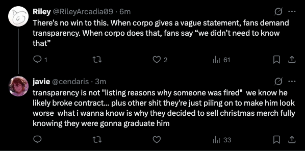 Don't understand why they leave the replies open on these termination tweets. They're just a breeding ground for shitflinging.