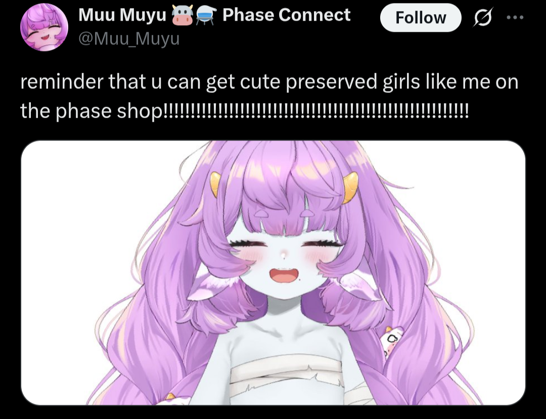▼ Phase Connect LinksOfficial Website: https://phase-connect.comOfficial Schedule: https://schedule.phase-connect.comOfficial Twitter: https://x.com/PhaseConnect | https://x.com/PhaseConnectJPOfficial Character References: https://rentry.org/pcgreferencesOfficial Twitch Archive Channels: https://rentry.org/pcgtwitcharchiveUnofficial Phase Connect Archives: https://rentry.org/pcgunofficialarchive––––––––––––––––––––––––––––––––––◆【Lia】https://x.com/rinkouashelia | https://youtube.com/RinkouAshelia | https://twitch.tv/asheliarinkou◆【Utatane Nasa】転寝ナサ (JP) https://x.com/UtataneNasa | https://youtube.com/UtataneNasa | https://twitch.tv/utatanenasa◆【Hakushika Iori】白鹿いおり (JP + EN) https://x.com/hakushikaiori | https://youtube.com/HakushikaIori | https://twitch.tv/iorihakushika◆【Fujikura Uruka】https://x.com/fujikurauruka | https://youtube.com/FujikuraUruka | https://twitch.tv/fujikurauruka◆【Shisui Michiru】紫翠みちる (JP) https://x.com/shisuimichiru | https://youtube.com/ShisuiMichiru | https://twitch.tv/michiru_shisui◆【Tenma Maemi】https://x.com/tenmamaemi | https://youtube.com/TenmaMaemi | https://twitch.tv/tenma◆【Pipkin Pippa】https://x.com/pipkinpippa | https://youtube.com/PipkinPippa | https://twitch.tv/pippa––––––––––––––––––––––––––––––––––◆【Kaneko Lumi】https://x.com/kaneko_lumi | https://youtube.com/KanekoLumi | https://twitch.tv/kanekolumi◆【Fuura Yuri】[Terminated] https://x.com/AmarisYuri | Archive: https://youtube.com/@TheNationalFuuraYuriArchive◆【Dizzy Dokuro】https://x.com/dizzydokuro | https://youtube.com/@dizzydokuro | https://twitch.tv/dizzydokuro◆【Jelly Hoshiumi】https://x.com/jellyhoshiumi | https://youtube.com/@jellyhoshiumi | https://twitch.tv/jellyhoshiumi◆【Ember Amane】https://x.com/emberamane | https://youtube.com/@EmberAmane | https://twitch.tv/emberamane◆【Clio Aite】https://x.com/ClioAite | https://youtube.com/@ClioAite | https://twitch.tv/clioaite◆【MariMari_en】https://x.com/MARIMARI_EN | https://youtube.com/@MARIMARI_EN | https://twitch.tv/marimari_en◆【Eepy Sleepy】https://x.com/EepySleepyCh | https://www.youtube.com/@EepySleepyCh | https://twitch.tv/EepySleepyCh––––––––––––––––––––––––––––––––––◆【Remilia Nephys】https://x.com/Remilia_Nephys | https://youtube.com/RemiliaNephys | https://twitch.tv/remilianephys◆【Chisaka Airi】https://x.com/ChisakaAiri | https://youtube.com/ChisakaAiri | https://twitch.tv/chisakaairi◆【Amanogawa Shiina】https://x.com/AmanogawaShiina | https://youtube.com/AmanogawaShiina | https://twitch.tv/amanogawashiina◆【Himemiya Rie】https://x.com/HimemiyaRie | https://youtube.com/HimemiyaRie | https://twitch.tv/himemiyarie◆【Erina Makina】https://x.com/ErinaMakina | https://youtube.com/ErinaMakina | https://twitch.tv/erinamakina◆【Komachi Panko】https://x.com/komachipanko | https://youtube.com/KomachiPanko | https://twitch.tv/komachipanko––––––––––––––––––––––––––––––––––◆【Runie Ruse】https://x.com/RunieRuse | https://youtube.com/@RunieRuse | https://twitch.tv/RunieRuse◆【Eimi Isami】https://x.com/eimiisami | https://youtube.com/@eimiisami | https://twitch.tv/eimiisami◆【Muu Muyu】https://x.com/Muu_Muyu | https://youtube.com/@MuuMuyu | https://twitch.tv/MuuMuyu◆【Hikanari Hina】https://x.com/HikanariHina | https://youtube.com/@HikanariHina | https://twitch.tv/HikanariHina◆【Saya Sairroxs】[Hort] https://x.com/sayasairroxs | https://youtube.com/@sayasairroxs | https://twitch.tv/sayasairroxs––––––––––––––––––––––––––––––––––◆【Kannagi Loki】巫ロキ (JP) https://x.com/kannagiloki | https://youtube.com/@kannagiloki◆【Kokoromo Memory】恋衣めもり (JP) https://x.com/kokoromomemory | https://youtube.com/@kokoromomemory_ | https://twitch.tv/kokoromomemory◆【Gram Pico】倉夢ぴこ (JP) https://x.com/grampico_ | https://youtube.com/@grampico | https://twitch.tv/grampico◆【Ayase Yuu】絢世ユウ (JP) https://x.com/ayaseyuuu | https://youtube.com/@ayaseyuu | https://twitch.tv/ayaseyuu_◆【Kaminari Clara】歌美鳴クララ (EN + JP) https://x.com/kaminariclara_ | https://youtube.com/@kaminariclara | https://twitch.tv/kaminariclara––––––––––––––––––––––––––––––––––◆【Malice Evermore】https://x.com/MaliceEvermore | https://www.youtube.com/@maliceevermore | https://www.twitch.tv/maliceevermore◆【Nitya Nil】https://x.com/Nitya_Nil | https://www.youtube.com/@Nitya_Nil | https://www.twitch.tv/nitya_nil◆【Wilhelmina Frost】https://x.com/wilhelminafr0st | https://www.youtube.com/@wilhelminafrost | https://www.twitch.tv/wilhelminafrost◆【Bibi Biscuit】https://x.com/BibiBiscuitCh | https://www.youtube.com/@bibibiscuitch | https://www.twitch.tv/bibibiscuitch◆【Anya Nyabyss】https://x.com/AnyaNyabyss | https://www.youtube.com/@AnyaNyabyss | https://www.twitch.tv/anyanyabyss◆【Sinon Sinfonia】https://x.com/SinonSinfonia | https://www.youtube.com/@SinonSinfonia | https://www.twitch.tv/sinonsinfoniaPrevious Thread: >>107933496