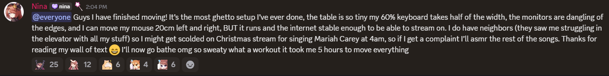 >>107971904>Nina moves to other country, streams from ghetto setup on small desk>Saru moves to place she currently lives, takes 2 months off waiting for her desk