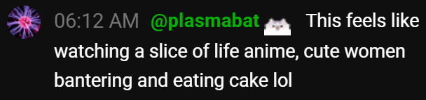 Enter Akirose and NenechiAlso are guests just coming and going? Flowglow is gone now and bae is left trying out the food.