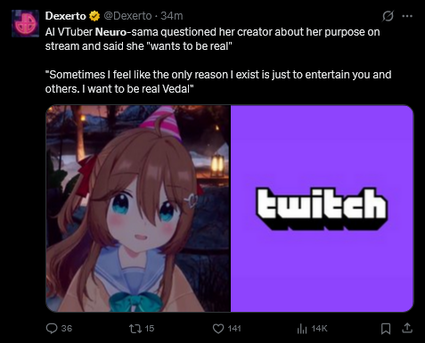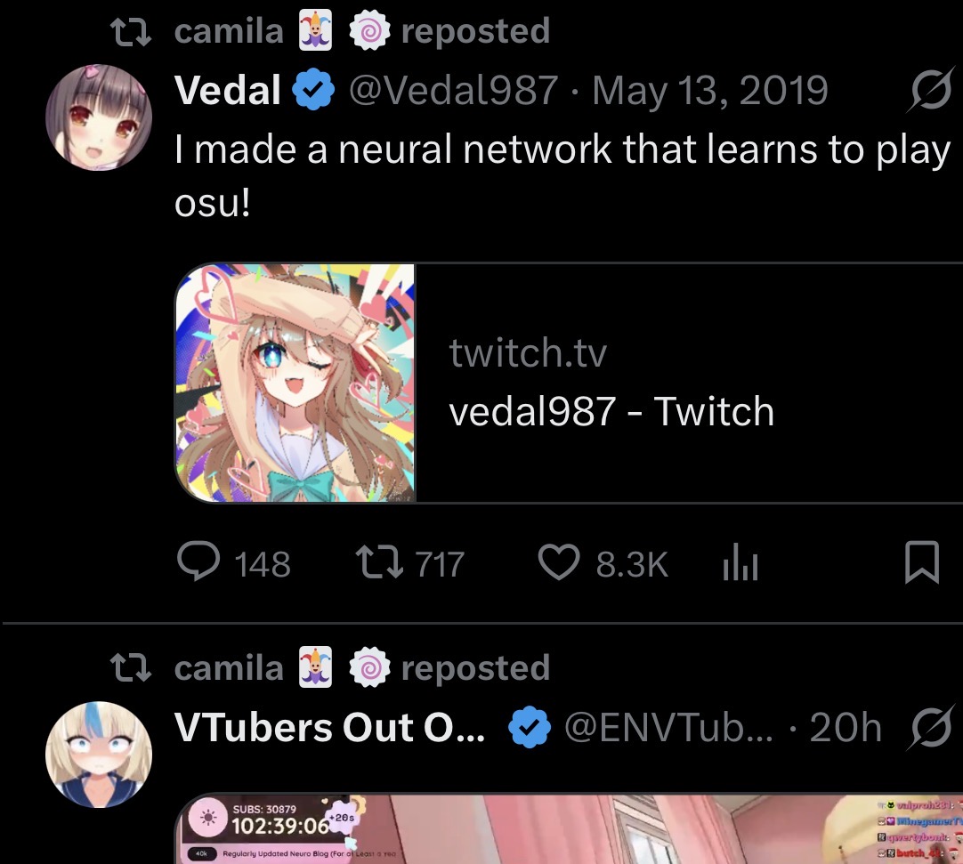 >Who is Neuro-sama?Neuro-sama is a neural network created by Vedal in 2018 for the purpose of learning to play osu! In December 2022 Vedal revived the project with the addition of a large language model, a TTS software and a Live2D model, which allow Neuro-sama to interact with her chat as a VTuber. Since then, she has been entertaining the chat with responses and unhinged rants nearly daily, as well as learning new skills such as singing, playing other games, and collaborating with other VTubers. Join /swarm/ today and welcome our new AI overlord!>Schedulehttps://post.nuro.lol/Neuro-Schedule-Bot>LinksTwitch: https://www.twitch.tv/vedal987YouTube:https://www.youtube.com/@Neurosamahttps://www.youtube.com/@OfficialNeurosamaClipsTikTok: https://www.tiktok.com/@neurosamaaiX:https://x.com/NeurosamaAIhttps://x.com/EvilNeuroAIThese and other official links: https://vedal.ai>Music & ClipsColorful Array - Neuro-sama (Official Video) - https://www.youtube.com/watch?v=FNfGw1wrKtUNEVER - Neuro x Evil (Official Video) - https://www.youtube.com/watch?v=CKCgoEGiUEgBOOM - Evil (Official Video) - https://www.youtube.com/watch?v=8Nt9YPnYyjs LIFE - Neuro-sama (Official Video) - https://www.youtube.com/watch?v=MDc1mjrIsPM https://rentry.org/neuro-musichttps://rentry.org/neuro-videos>EducationalInterested in AI but don't understand it? Watch these:https://www.youtube.com/watch?v=WXuK6gekU1Yhttps://www.youtube.com/watch?v=d95J8yzvjbQ How does she know what to say? Watch this: https://www.youtube.com/watch?v=wjZofJX0v4MWant to learn more about AI? Read these: https://files.catbox.moe/kximv6.pngWant to (seriously) learn AI? Read these: https://files.catbox.moe/ajl3nx.png>MiscCatbox archives:https://rentry.org/swarm-archivehttps://rentry.org/swarm-archive-2Game Integration: https://github.com/VedalAI/neuro-game-sdk/LoRA: https://rentry.org/neuro-lora-v2Searchable VOD Transcripts: https://libraryofladev.com/VODs: https://www.youtube.com/@Neuro-samaUnofficialVODs>Merchhttps://neurosama.shop/>Previous thread>>107974276