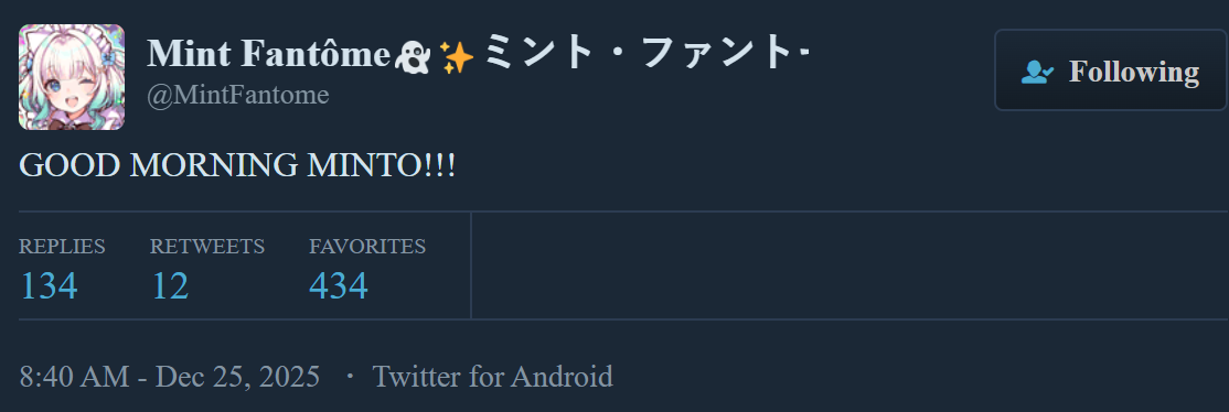 https://x.com/MintFantome/status/2004200464431153203God damn me if it isn't GOOD MORNING MINTO!!!