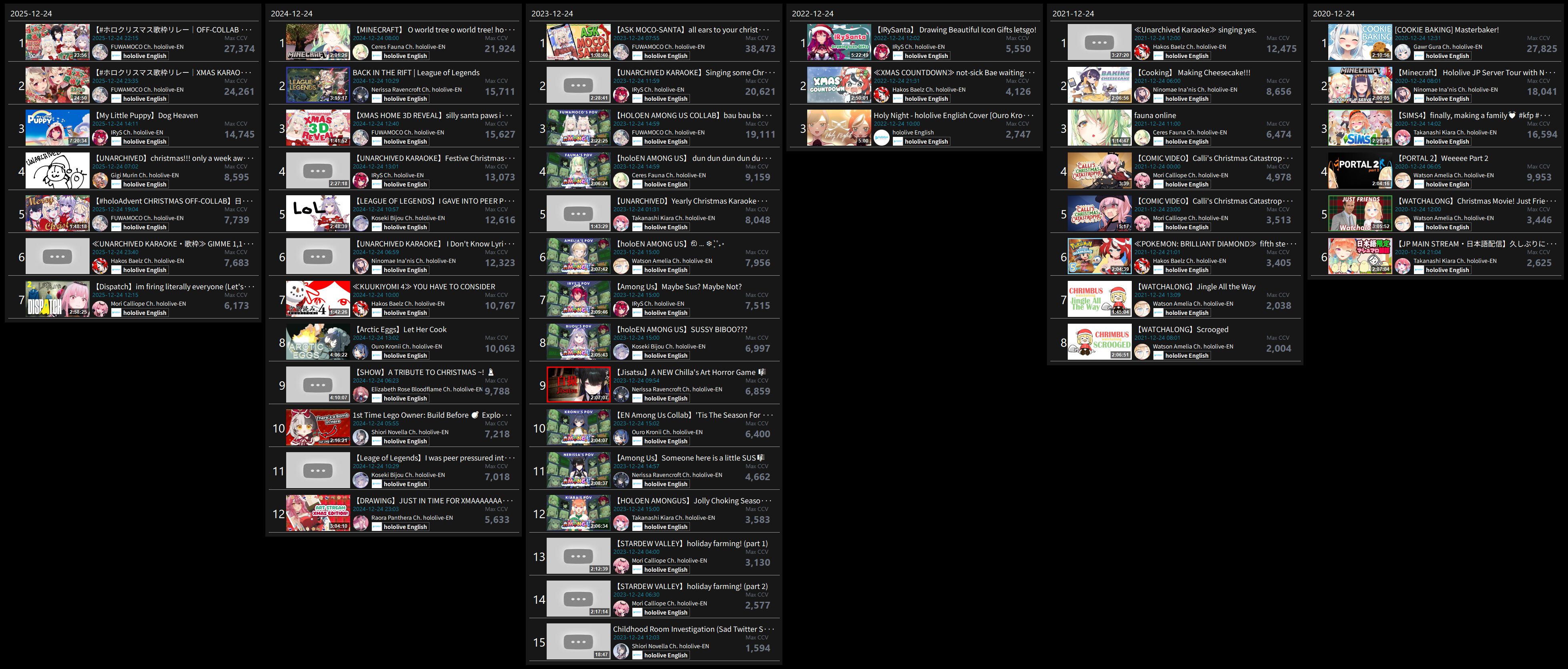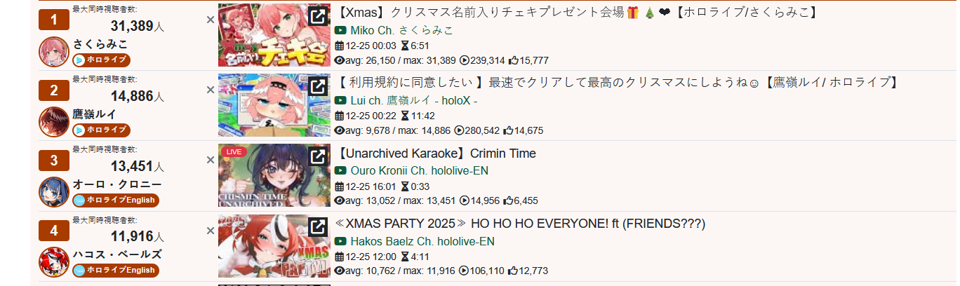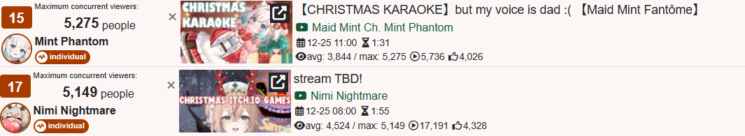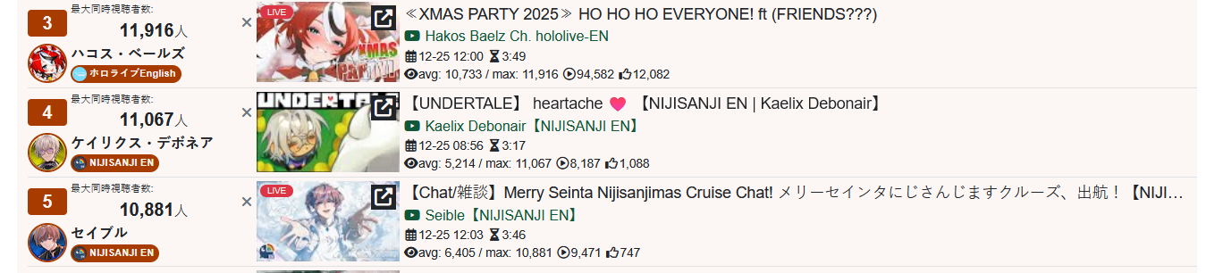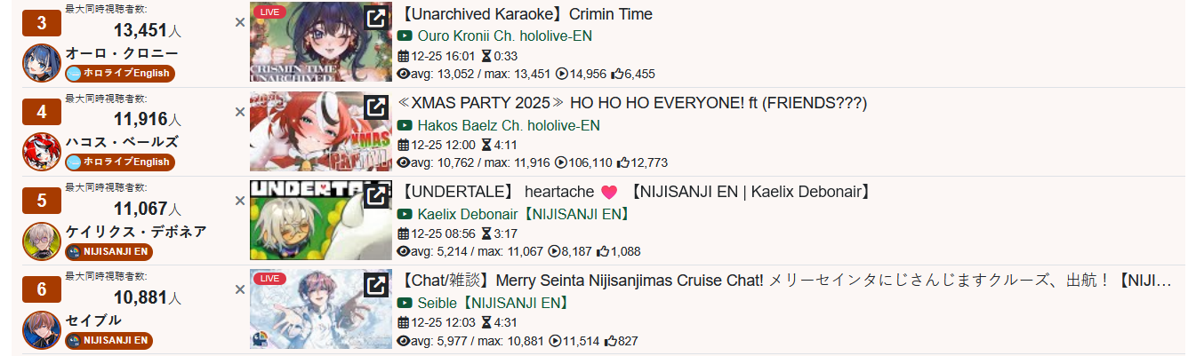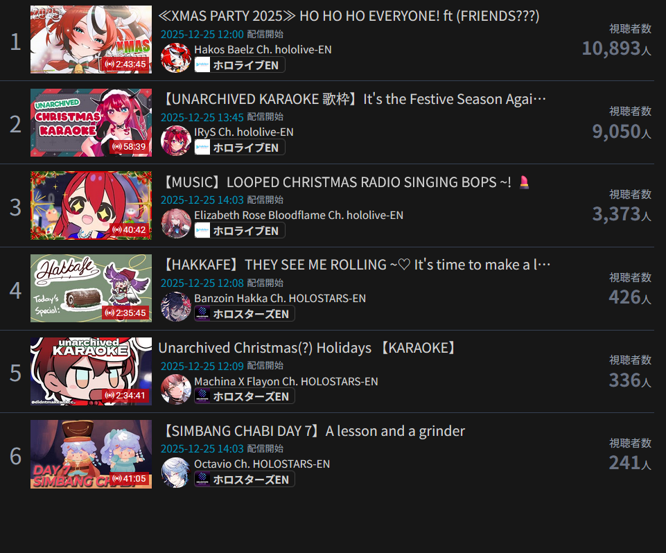 >>108000796>>108000830>date - peak - time of day, archive status, occasion2021/10/12 - 9927 - JP hours, archived, guerilla2021/10/21 - 9238 - NA hours, archived, 100 day celebration2023/01/03 - 9863 - JP hours new years, archived, guerilla2023/11/11 - 9832 - JP hours, archived, guerilla2025/09/13 - 8913 - JP hours, archived, guerilla2025/10/16 - 9426 - NA hours, archived, pre-cover releaseMy filter picked up 71 karaokes. Of them, only 6 were sub-10k, all were archived. 4 guerillas in JP hours. I won't bother to check for extenuating circumstances (length, overlap) but an IRyS karaoke is effectively guaranteed to 10k.>>108000981>>108001007Kronii had one last year. If you allow graduated girls, Gura and Mumei never dropped below 10k. Mumei got close with the infamous gobble gobble, but no cigar.