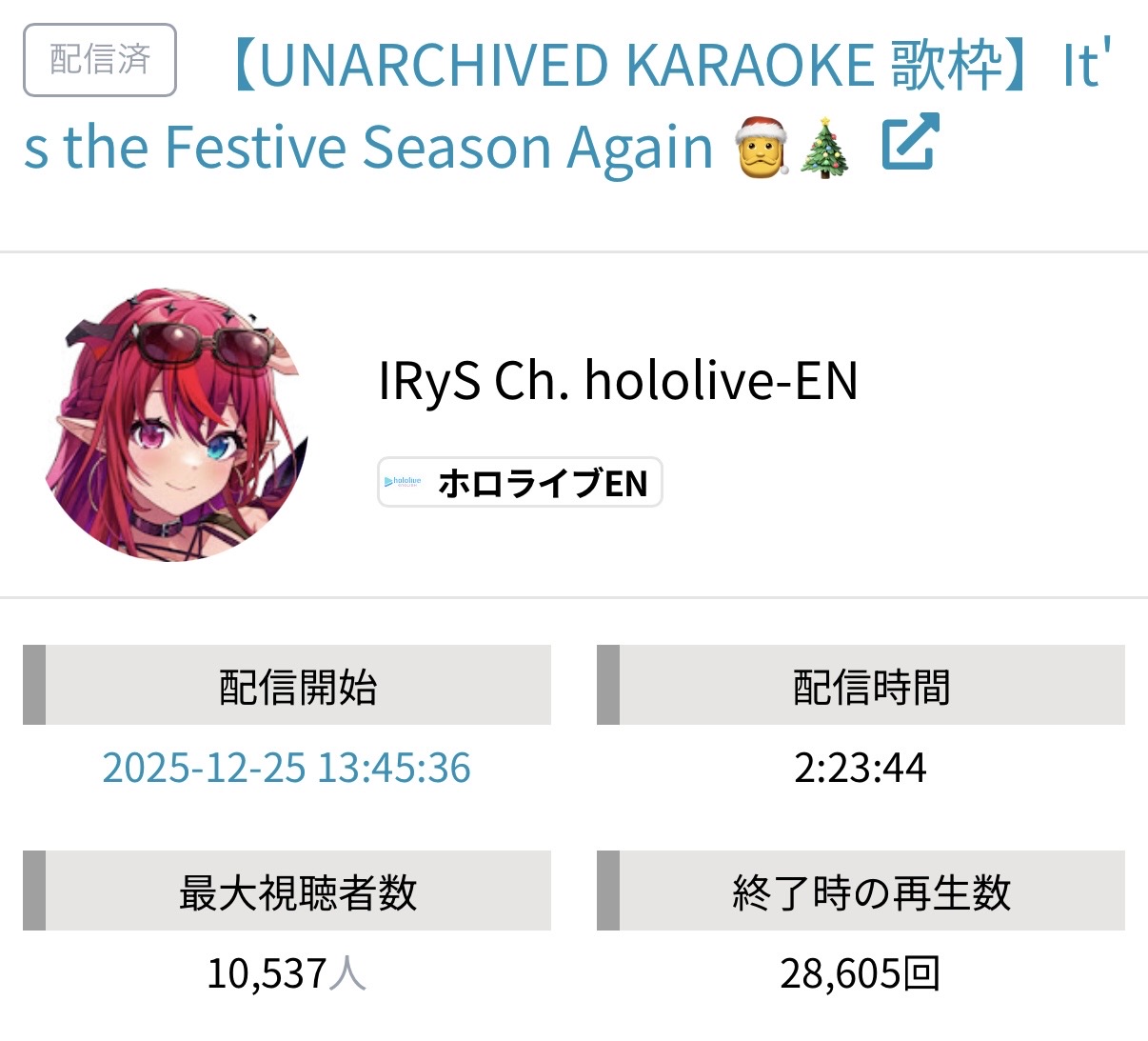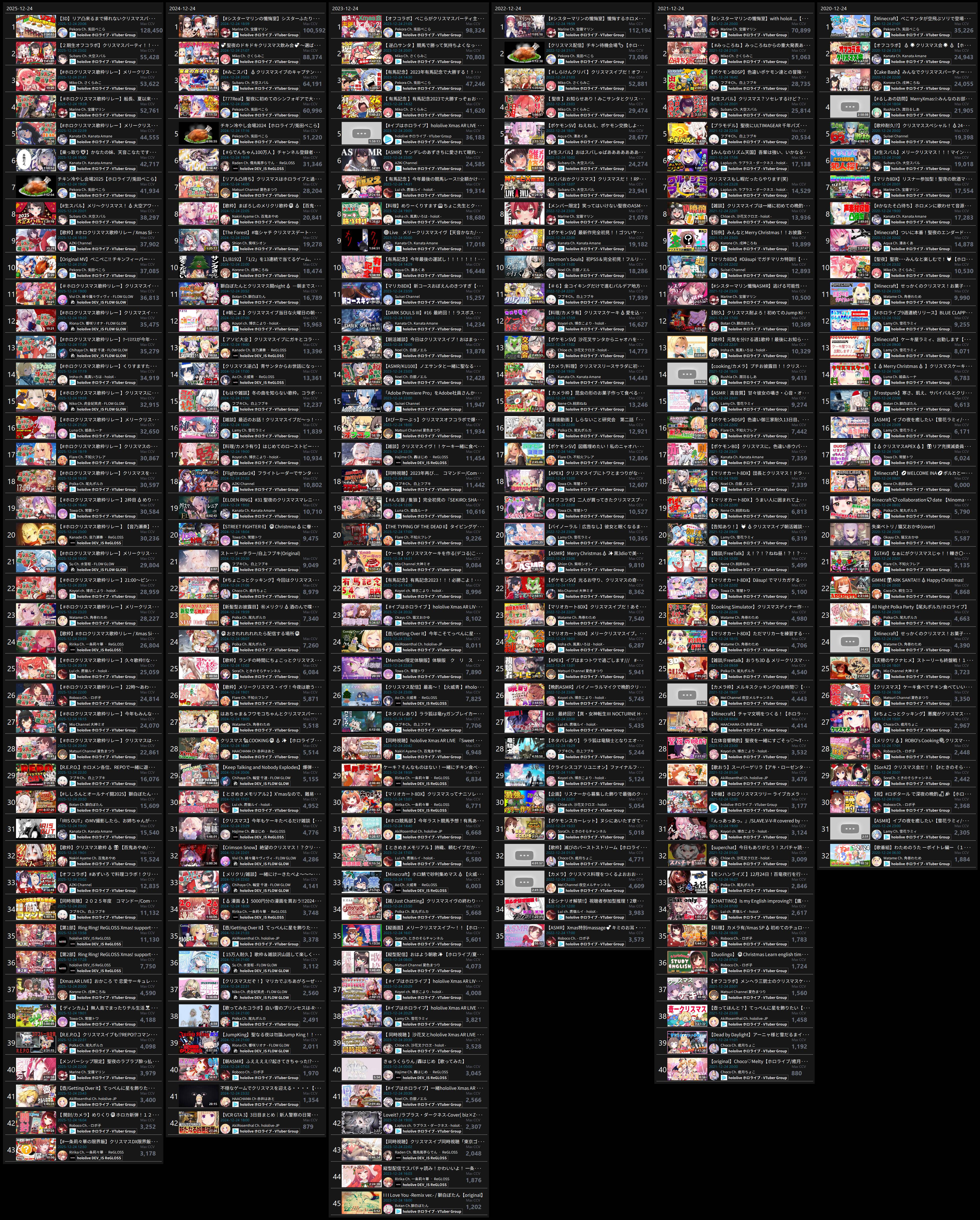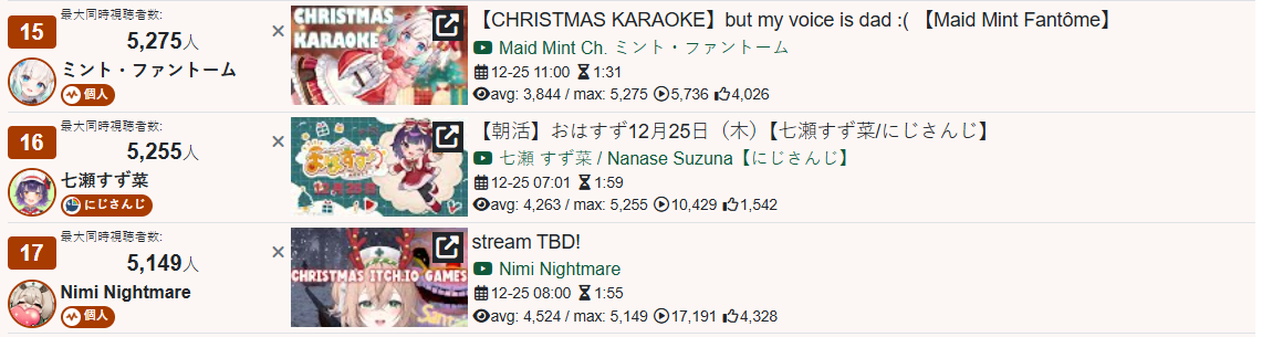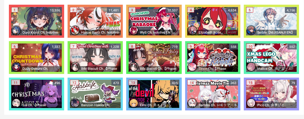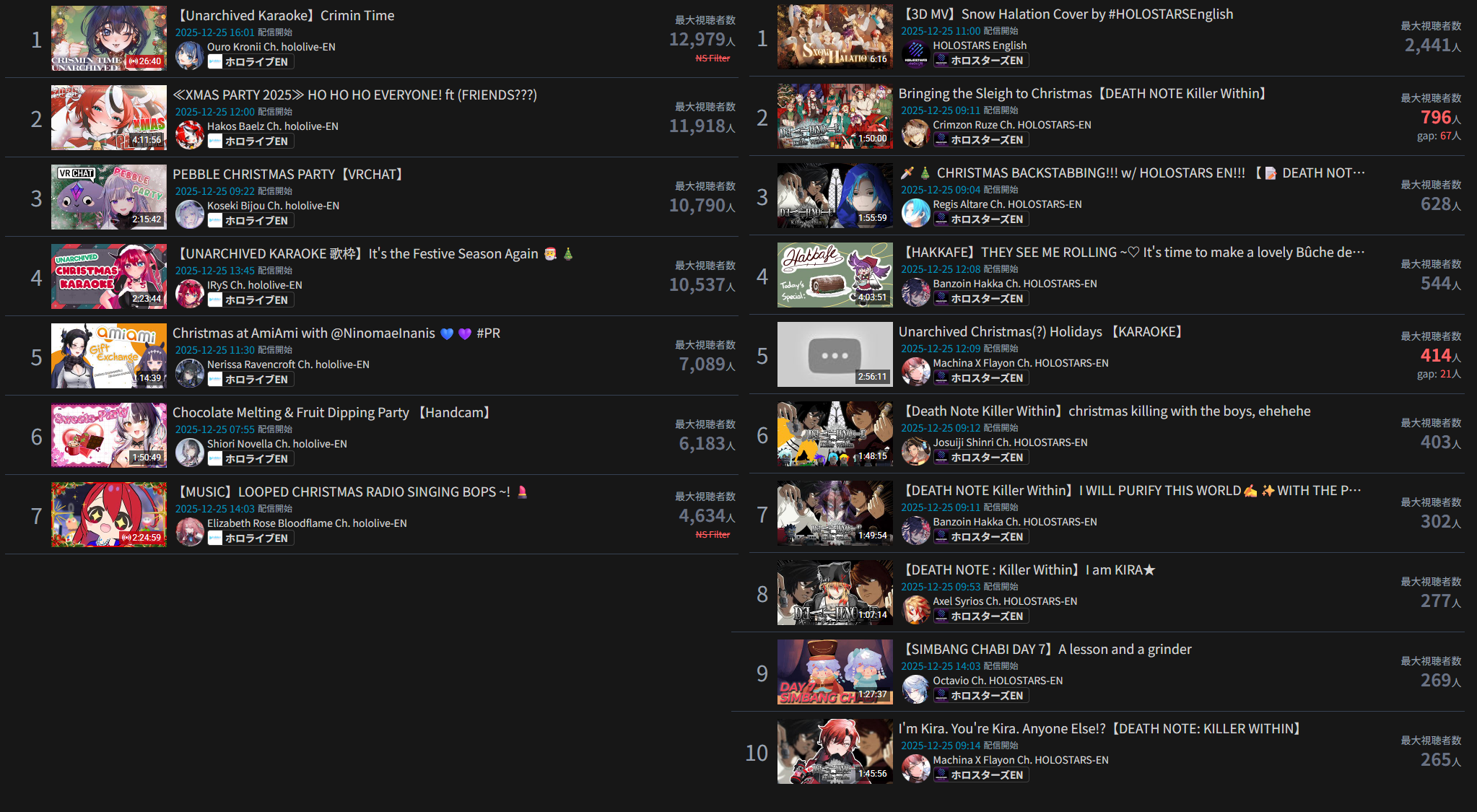 >>108000796>>108000830>date - peak - time of day, archive status, occasion2021/10/12 - 9927 - JP hours, archived, guerilla2021/10/21 - 9238 - NA hours, archived, 100 day celebration2023/01/03 - 9863 - JP hours new years, archived, guerilla2023/11/11 - 9832 - JP hours, archived, guerilla2025/09/13 - 8913 - JP hours, archived, guerilla2025/10/16 - 9426 - NA hours, archived, pre-cover releaseMy filter picked up 71 karaokes. Of them, only 6 were sub-10k, all were archived. 4 guerillas in JP hours. I won't bother to check for extenuating circumstances (length, overlap) but an IRyS karaoke is effectively guaranteed to 10k.>>108000981>>108001007Kronii had one last year. If you allow graduated girls, Gura and Mumei never dropped below 10k. Mumei got close with the infamous gobble gobble, but no cigar.