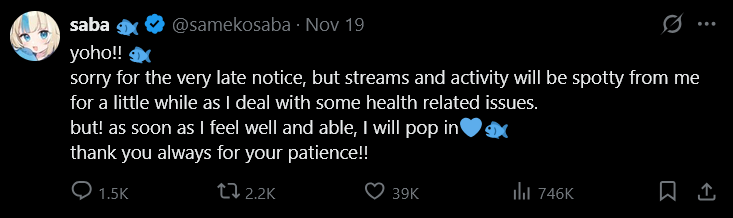 >>108005195this is her last tweet, it says she will pop in as soon as she feels well and able, she has not popped in, therefore the logical conclusion is she is not feeling well or able