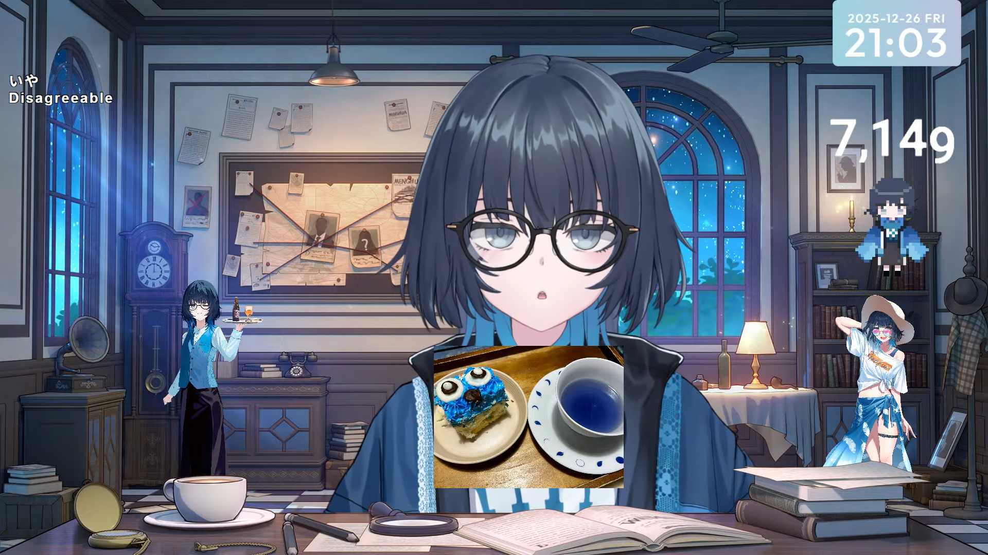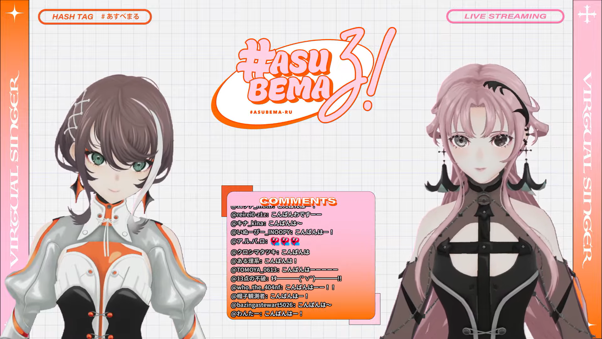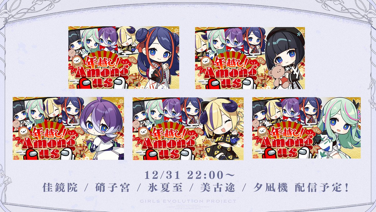 Song Frames and Special EventsOumua x KOEhttps://www.youtube.com/watch?v=_ABfptVLSjQTokiwa Aino 1 hour song framehttps://www.youtube.com/watch?v=qH8i1UzQEGUHiura Kurohttps://www.youtube.com/watch?v=OICqanSA8eQAomi Non 3D CF starts at 2200 JSThttps://www.youtube.com/watch?v=wa4fkOrScbkUten Hiyorihttps://www.youtube.com/watch?v=mQK0HYoYhp4Eba Kyoukahttps://www.youtube.com/watch?v=0pKZv90711YMUS1CAhttps://www.youtube.com/watch?v=gMQcxzuSFo0Anya Kumori 25K endurancehttps://www.youtube.com/watch?v=GW2IauNPuMwNagisawa Shichi last acoustic guitar frame of the year shortshttps://www.youtube.com/watch?v=mmkk560HzEE