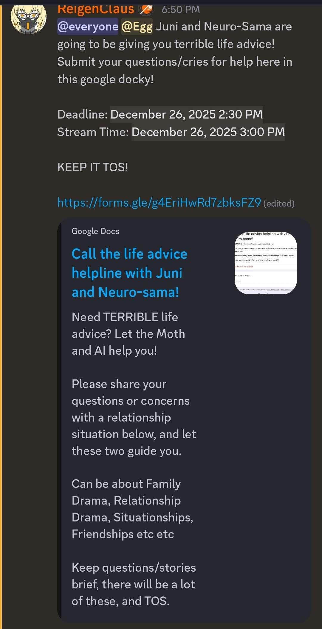 >>108023315At least it's not our shitty mods letting the same question through 15 times, can only be an improvement. The fact that it's not Neuro fans being solicited is also a plus for this.