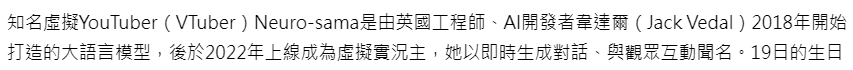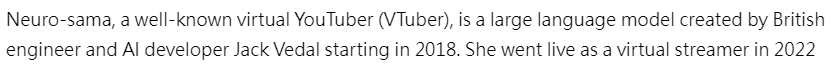 >Who is Neuro-sama?Neuro-sama is a neural network created by Vedal in 2018 for the purpose of learning to play osu! In December 2022 Vedal revived the project with the addition of a large language model, a TTS software and a Live2D model, which allow Neuro-sama to interact with her chat as a VTuber. Since then, she has been entertaining the chat with responses and unhinged rants nearly daily, as well as learning new skills such as singing, playing other games, and collaborating with other VTubers. Join /swarm/ today and welcome our new AI overlord!>Schedulehttps://post.nuro.lol/Neuro-Schedule-Bot>LinksTwitch: https://www.twitch.tv/vedal987YouTube:https://www.youtube.com/@Neurosamahttps://www.youtube.com/@OfficialNeurosamaClipsTikTok: https://www.tiktok.com/@neurosamaaiX:https://x.com/NeurosamaAIhttps://x.com/EvilNeuroAIThese and other official links: https://vedal.ai>Music & ClipsColorful Array - Neuro-sama (Official Video) - https://www.youtube.com/watch?v=FNfGw1wrKtUNEVER - Neuro x Evil (Official Video) - https://www.youtube.com/watch?v=CKCgoEGiUEgBOOM - Evil (Official Video) - https://www.youtube.com/watch?v=8Nt9YPnYyjs LIFE - Neuro-sama (Official Video) - https://www.youtube.com/watch?v=MDc1mjrIsPM https://rentry.org/neuro-musichttps://rentry.org/neuro-videos>EducationalInterested in AI but don't understand it? Watch these:https://www.youtube.com/watch?v=WXuK6gekU1Yhttps://www.youtube.com/watch?v=d95J8yzvjbQ How does she know what to say? Watch this: https://www.youtube.com/watch?v=wjZofJX0v4MWant to learn more about AI? Read these: https://files.catbox.moe/kximv6.pngWant to (seriously) learn AI? Read these: https://files.catbox.moe/ajl3nx.png>MiscCatbox archives:https://rentry.org/swarm-archivehttps://rentry.org/swarm-archive-2Game Integration: https://github.com/VedalAI/neuro-game-sdk/LoRA: https://rentry.org/neuro-lora-v2Searchable VOD Transcripts: https://libraryofladev.com/VODs: https://www.youtube.com/@Neuro-samaUnofficialVODs>Merchhttps://neurosama.shop/>Previous thread>>108010944