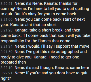 >>108034981>she clearly talked about management fucking up multiple times and not improving through the yearsThat's why she's leaving.> "if a Holomem suddenly contacted me and gave me a chance to talk while I was at my worst, I probably wouldn't have left."This is why she was considering burning bridhes. Holomem did NOT suddenly contact her and talk to her when she was at her worst. Even the one who was known to always talk to her every day stopped talking to her and could only tell her to "be happy" now that she will be gone.These are two different things and management doesn't really have anything to do with the other.
