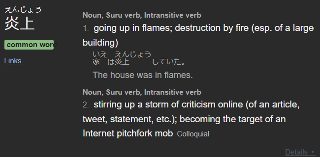 >>108034694炎上 (go up in flames) is being used as "causing a lot of criticism online" or something to that effect