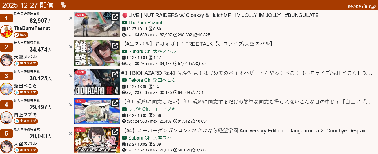 Goodnight /lig/, here are tonight's numbers. I'm gonna be busy for basically all of her streams this weekend uuuuuuuuuuuuNumbers for 12/26:1: https://twitch.tv/vedal987 (11,445)2: https://twitch.tv/ironmouse (8,389)3: https://twitch.tv/henyathegenius (3,990)4: https://twitch.tv/Zentreya (3,824)5: https://www.youtube.com/@niminightmare (3,759)6: https://www.youtube.com/@mintfantome (3,628)7: https://twitch.tv/Buffpup (3,141)8: https://twitch.tv/MichiMochievee (2,966)9: https://www.youtube.com/@KirscheVerstahl (2,739) *Combined10: https://twitch.tv/Sykkuno (2,489)Non-English:1: https://www.youtube.com/@Ririka_krmzw0707 (13,128) *Japanese2: https://twitch.tv/tororo_vtuber (5,660) *Japanese3: https://twitch.tv/KSPKSP (2,995) *Chinese
