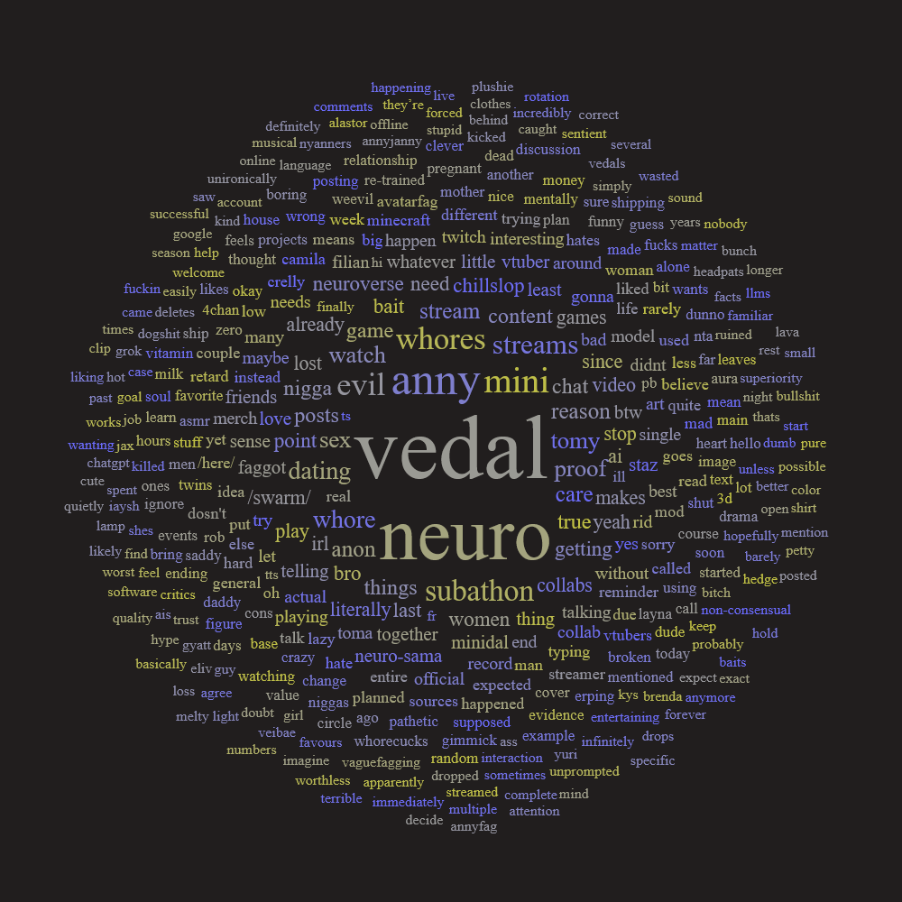 >Anny gone because of swarmniggers harassing her>Toma gone for private reasons>Sinder gone due to getting involved in drama>Mega gone from leaving willingly>Filian gone due to debuting to a clean slate and not looking back>Saurei gone due to a myriad of reaosns like AI derangement syndrome>Numi gone due to Vedal hurting her brand>Layna almost gone due going menhera, brought back recently2025 was the year of Neuro indeed, whores keep leaving and will continue to do so. Cerber is next if yesterdays stream where she talked about her insecurities are anything to go by.