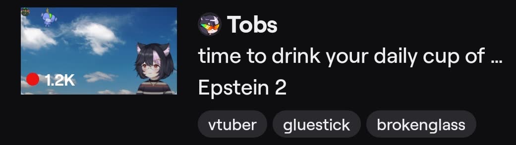 >>108115905>>108115920>>108116104>>108116134https://www.youtube.com/watch?v=gLshe3L3B90&t=11928s>Filian: Are you gay? *snorts*>Tob: No.>Filian: Wait, you're straight?>Tob: Yeah.>>108116052>>108116114The ex-boyfriend in that situation was the ex of the woman who crashed into Tob and not Tob herself.