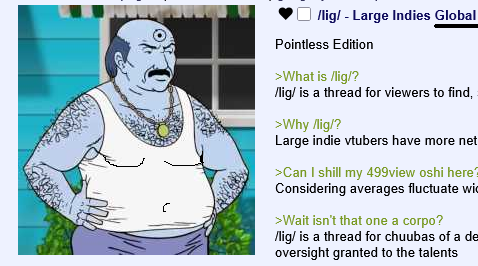 Pointless Edition>What is /lig/?/lig/ is a thread for viewers to find, share, and discuss indie vtubers who have on average 500 viewers or more.>Why /lig/?Large indie vtubers have more net fans, but they are outnumbered by 2views by the thousands. This is a thread for the VIP, regardless of what language they stream on.>Can I shill my 499view oshi here?Considering averages fluctuate widely, all the way down to 100 is reasonable. The minimal requirement however is being Twitch partner or the YouTube equivalent in numbers.>Wait isn't that one a corpo?/lig/ is a thread for chuubas of a decent size who aren't defined by their corporate branding, either due to the small size of the corporation or the independence and lack of oversight granted to the talents>/lig/ Numbershttps://lignumbers.neocities.org/>Twitch Clips Guidehttps://pastelink.net/34vd5>VOD Archival Guidehttps://rentry.org/Vod_Archival_Guide>/lig/ VOD Archivehttps://rentry.org/Indie_Vod_Archives_lig>Koikatsu cardshttps://mega.nz/folder/JYtkXJwL#07gAQCQqI_9FsmX9oQJKSA>/lig/ Wheel of Nameshttps://wheelofnames.com/49w-z2x>Tiermakerhttps://tiermaker.com/create/-lig--16586688-3>/lig/ Chuuba Birthday Calendar (WIP)https://www.canva.com/design/DAE-XgWodVg/ofLz4QC1yPPQ4T6TTAE0fw/edit?utm_content=DAE-XgWodVg>Upcoming BirthdaysDecember 31st - Naiyo SpedeJanuary 2nd - MilkyJanuary 3rd - Olivia MonroeJanuary 10th - Essie_chJanuary 11th - Clauvio & IronmouseJanuary 14th - Shimada TigerJanuary 22nd - Lily HopkinsJanuary 24th - YuzuJanuary 25th - /lig/February 4th - Matara KanFebruary 5th - Bodega Rat>OC material for the OPhttps://mega.nz/folder/IIVD1IaJ#cfsRhWdJvzneIoG8HZUPuw>/lig/booruhttps://ligbooru.moe/>Duckshttps://www.twitch.tv/dashducksOther useful threads:>>>/vt//big/>>>/vt//corpo/>>>/vt//choc/>>>/vt//flip/>>>/vt//haha/>>>/vt//indie/>>>/vt//mint/>>>/vt//swarm/>>>/vt//vrt/>>>/vt//xvsj+/Previous Thread: >>108112409