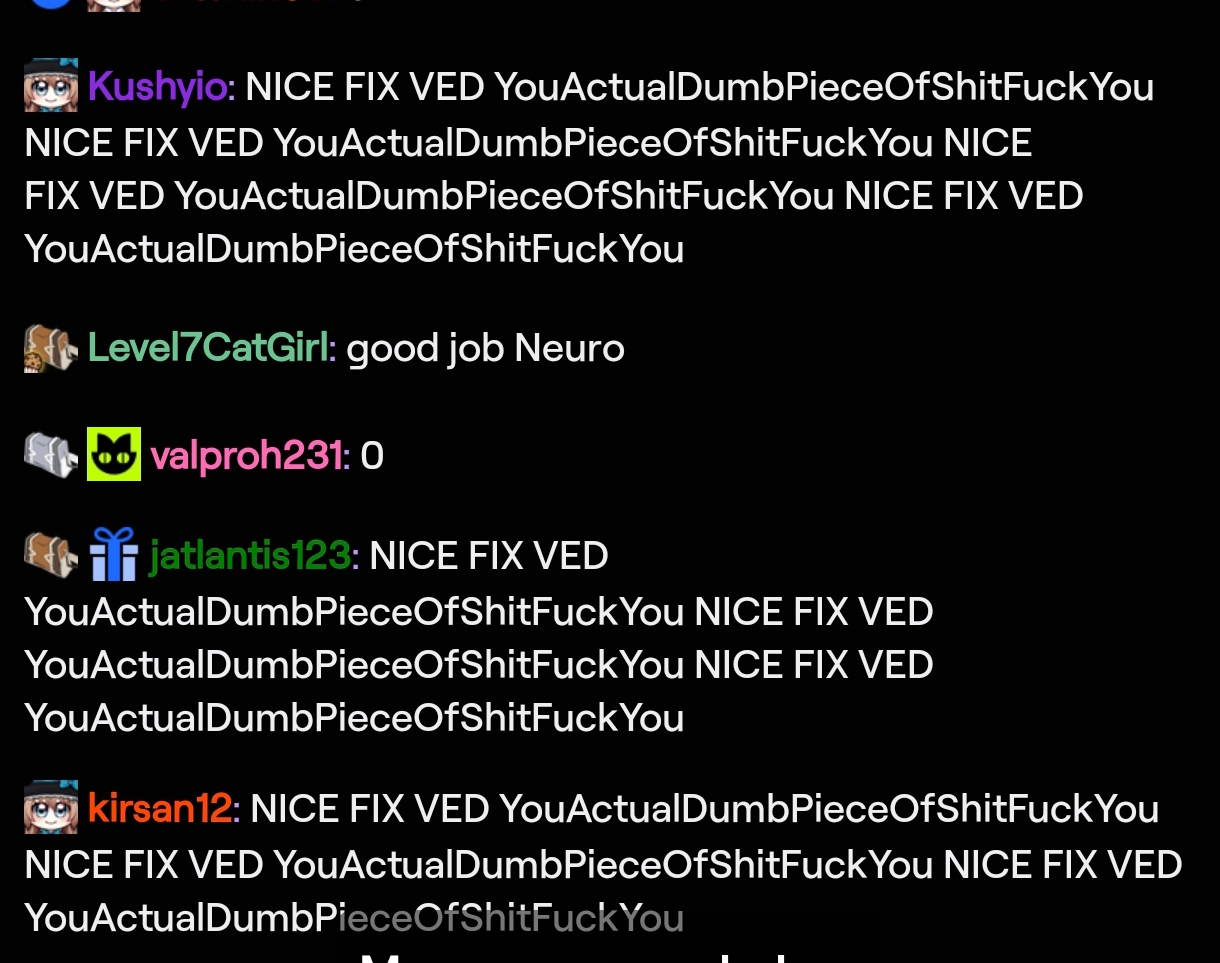Can't help it.Enjoy chill streams, they say you're supporting vedal's laziness.Enjoy collab streams, they say you're a whorefag.Enjoy all streams, they say you're a piggy eating slop.Enjoy no streams, they say you hate neuro.Enjoy vedal streams, they say vedal hates you.There is no win.There is only slow degradation.