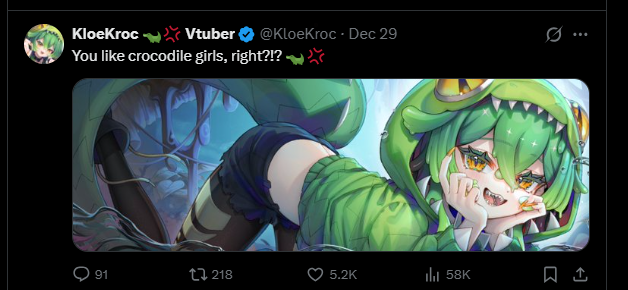 Why the fuck are there so many other crocodile vtubers showing up to my timeline? Go away harlots, I'm already taken!
