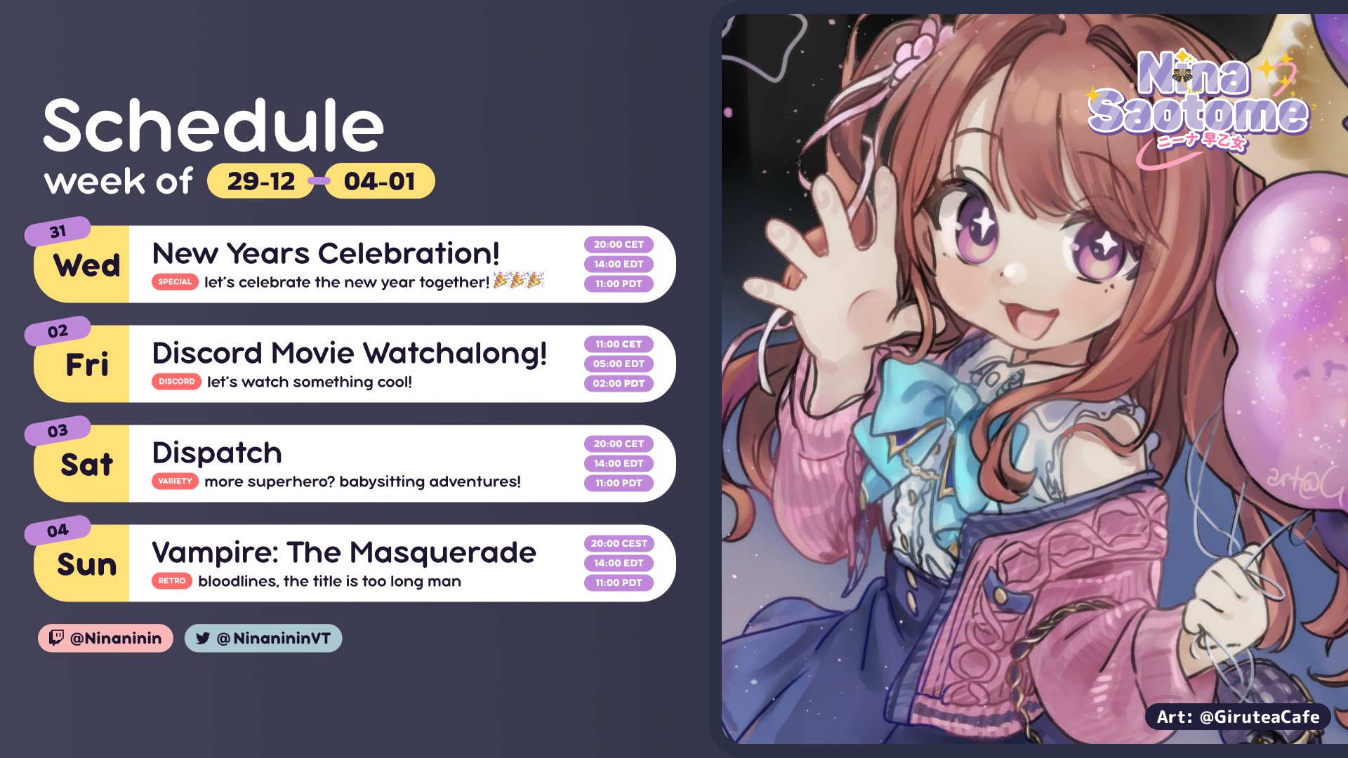 NEW YEAR! Let's welcome 2026 together!https://www.twitch.tv/ninaninin>who is Nina?Welcome to /nina/! This thread is dedicated to Nina Saotome, an indie VTuber and VSinger. Her content includes gaming (retro, kusoge, RPGs...), zatsudan and singing.She is known for her powerful and sultry singing voice, her sisterly personality and her hard work.>Interested in how Nina sings?Here is a small selection of her covers:https://www.youtube.com/watch?v=e8LkXeuwkwwhttps://www.youtube.com/watch?v=Tgf6qWaGuPAhttps://www.youtube.com/watch?v=MMF38a9B-n4https://www.youtube.com/watch?v=MXjuMwcvpQM>Other links and resources>Youtubehttps://www.youtube.com/@NinanininVT/videos>Twitterhttps://x.com/ninanininvtR18: https://x.com/hashtag/Ninintai?src=hashtag_click&f=live>Unofficial VOD archivesNew: https://youtube.com/@NinaVODsOld: https://youtube.com/@annalsoflevtia2846>Unofficial archive of various lewd OC, KK and sloppahttps://mega.nz/folder/hzcijZBD#TeezhbzpKoJulQTSvgzn9w>Related threadsLarge indies >>>/vt//lig/Western VTubers >>>/vt//wvt/Previous thread: >>108102196