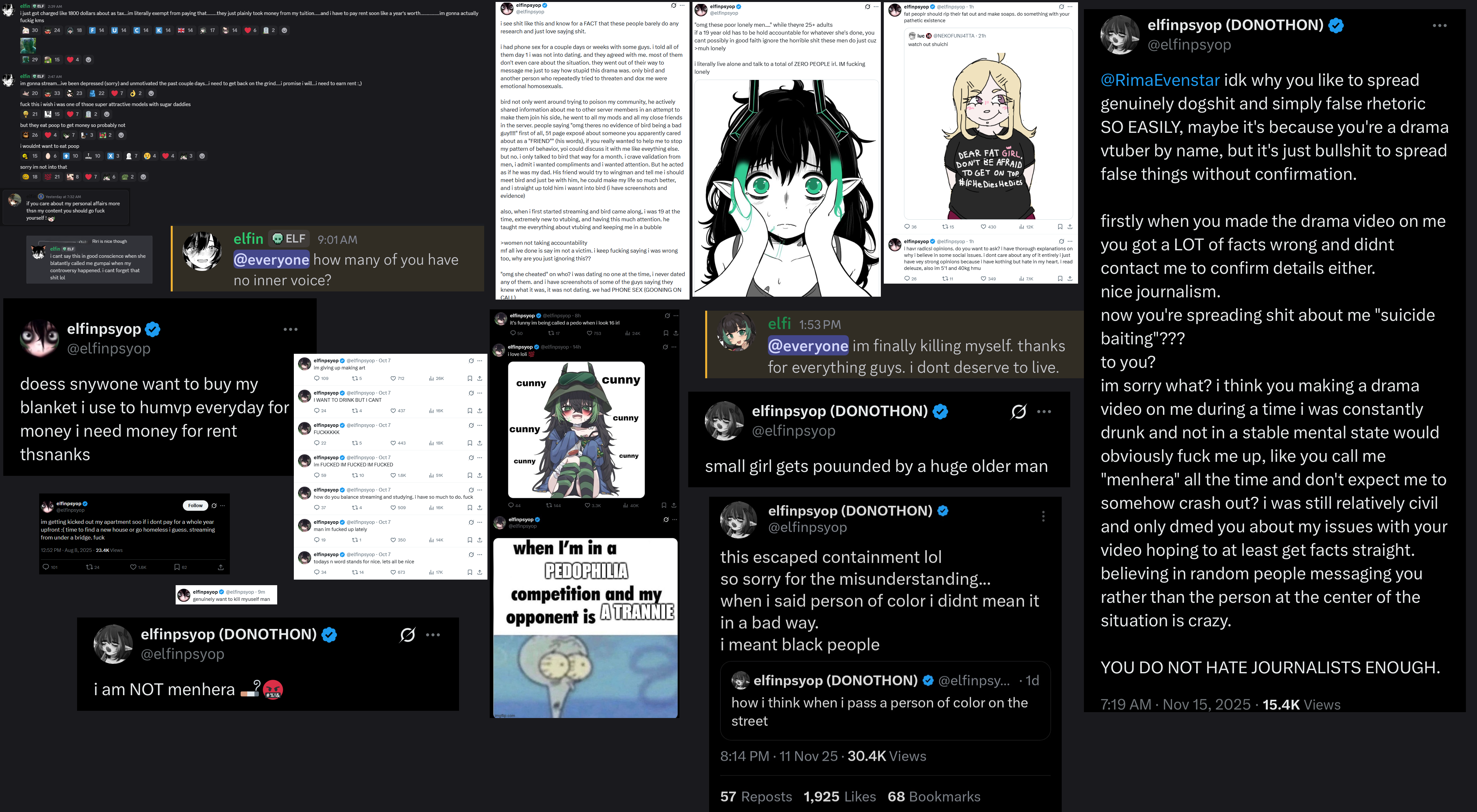 >>108199388I genuinely hope she is doing okay. Elfin, if you are reading this, take some time off, touch some grass, regain your mental stability and composure. Let this blow over and continue with the people who still remain. With enough mental fortitude and patience, you will outlast this too. If Ririgaki can survive having a black boyfriend, you can survive being (half?) paki.