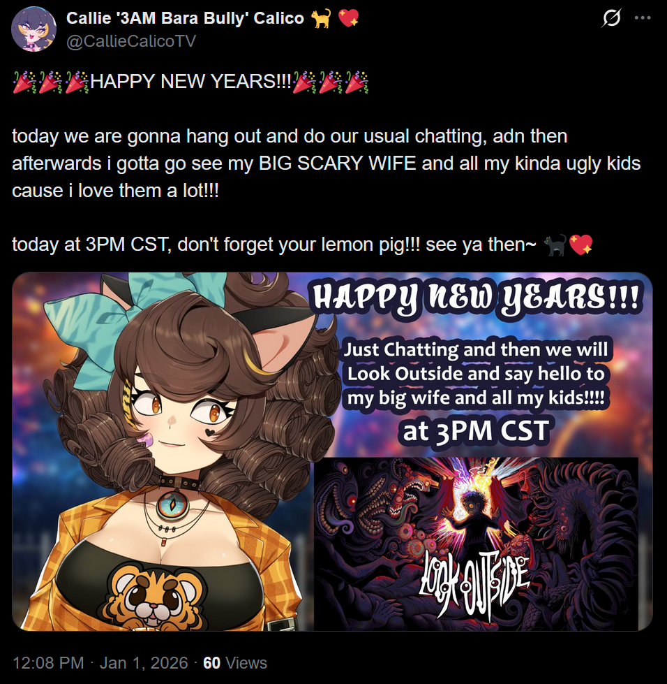 GMM Edition >What is /lig/?/lig/ is a thread for viewers to find, share, and discuss indie vtubers who have on average 500 viewers or more.>Why /lig/?Large indie vtubers have more net fans, but they are outnumbered by 2views by the thousands. This is a thread for the VIP, regardless of what language they stream on.>Can I shill my 499view oshi here?Considering averages fluctuate widely, all the way down to 100 is reasonable. The minimal requirement however is being Twitch partner or the YouTube equivalent in numbers.>Wait isn't that one a corpo?/lig/ is a thread for chuubas of a decent size who aren't defined by their corporate branding, either due to the small size of the corporation or the independence and lack of oversight granted to the talents>/lig/ Numbershttps://lignumbers.neocities.org/>Twitch Clips Guidehttps://pastelink.net/34vd5>VOD Archival Guidehttps://rentry.org/Vod_Archival_Guide>/lig/ VOD Archivehttps://rentry.org/Indie_Vod_Archives_lig>Koikatsu cardshttps://mega.nz/folder/JYtkXJwL#07gAQCQqI_9FsmX9oQJKSA>/lig/ Wheel of Nameshttps://wheelofnames.com/49w-z2x>Tiermakerhttps://tiermaker.com/create/-lig--16586688-3>/lig/ Chuuba Birthday Calendar (WIP)https://www.canva.com/design/DAE-XgWodVg/ofLz4QC1yPPQ4T6TTAE0fw/edit?utm_content=DAE-XgWodVg>Upcoming BirthdaysDecember 31st - Naiyo SpedeJanuary 2nd - MilkyJanuary 3rd - Olivia MonroeJanuary 10th - Essie_chJanuary 11th - Clauvio & IronmouseJanuary 14th - Shimada TigerJanuary 22nd - Lily HopkinsJanuary 24th - YuzuJanuary 25th - /lig/February 4th - Matara KanFebruary 5th - Bodega Rat>OC material for the OPhttps://mega.nz/folder/IIVD1IaJ#cfsRhWdJvzneIoG8HZUPuw>/lig/booruhttps://ligbooru.moe/>Duckshttps://www.twitch.tv/dashducks (embed) (embed) (embed) (embed) (embed) (embed)Other useful threads:>>>/vt//big/>>>/vt//corpo/>>>/vt//choc/>>>/vt//flip/>>>/vt//haha/>>>/vt//indie/>>>/vt//mint/>>>/vt//swarm/>>>/vt//vrt/>>>/vt//xvsj+/Previous Thread: >>108223377