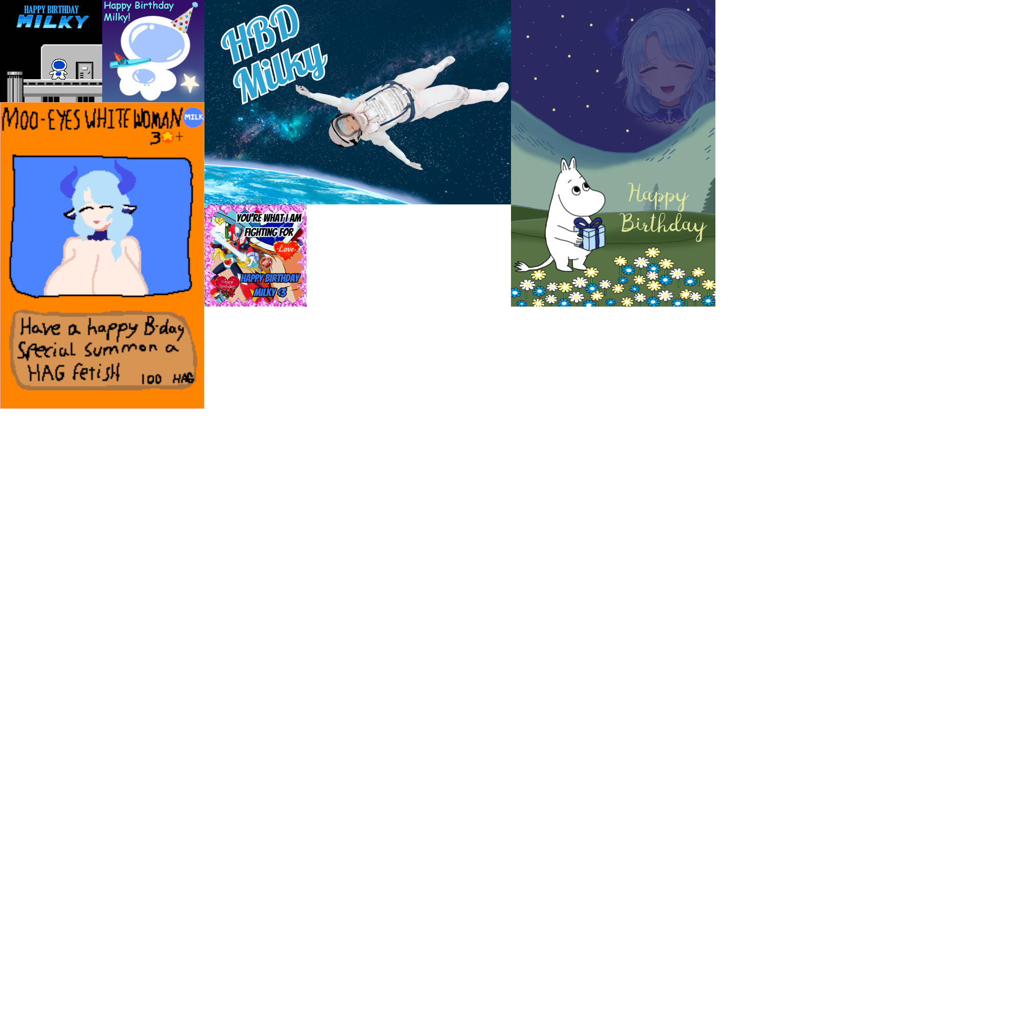 IN SEVEN HOURS it will be Milky's birthday, so please feel free to add to her birthday card! Submissions must have image dimensions that are in multiples of 200 (I.E. 200x200, 400x200, 400x400, etc.), and all submissions must be SFW though you may refer to suitable related terms such as MILF, boobs, etc. but please do not include any explicit content/words.Some things for inspiration:>Loves cosmic/space, tarot, nature, baking, cottagecore and girly aesthetics>Enjoys clamp manga/anime such as Cardcaptor Sakura and Chobits, but also series like Digimon, Hunter X Hunter, Sailor moon, and Princess Tutu>Her iconic color is blue, but her favourite colours include seafoam green, mint, and lavender>favorite flower is Lavender, but also loves hydrangeas, tulips, and lily of the valley>Favorite games/series includes Sonic, Mega Man, Pop'n Music, and currently Infinity NikkiThe deadline for the card is January 2nd at midnight EST, that's 9pm January 1st for PST. Make sure you get your submissions in before thenModel References:https://drive.google.com/drive/u/0/folders/1lhBVhCa6dQZFDryMWB8jYFQNhgkwFDJE