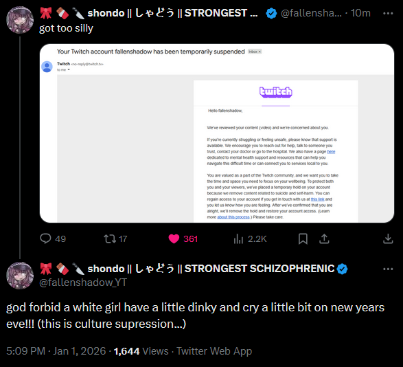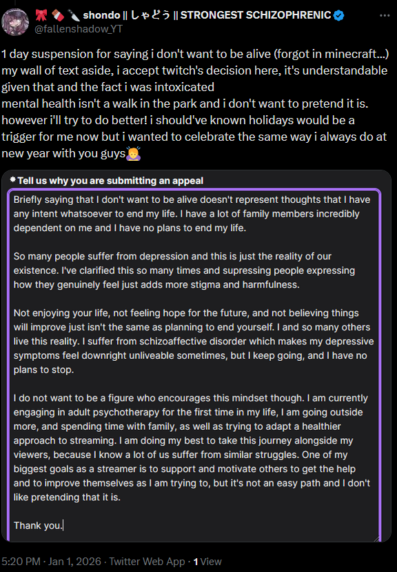 >>108236237>>108236243There's nothing wrong with being suicidal, Twitch should just stop being a baby about it
