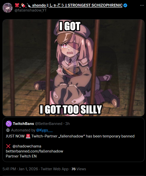 >>108236128>>108236099>gets banned for being drunk and suicidal on stream >does it again Kinda funny how there's just one thing she had to avoid doing and she did it anyway