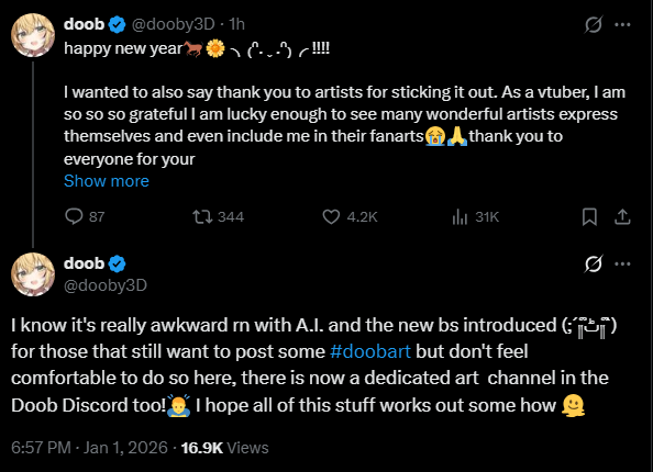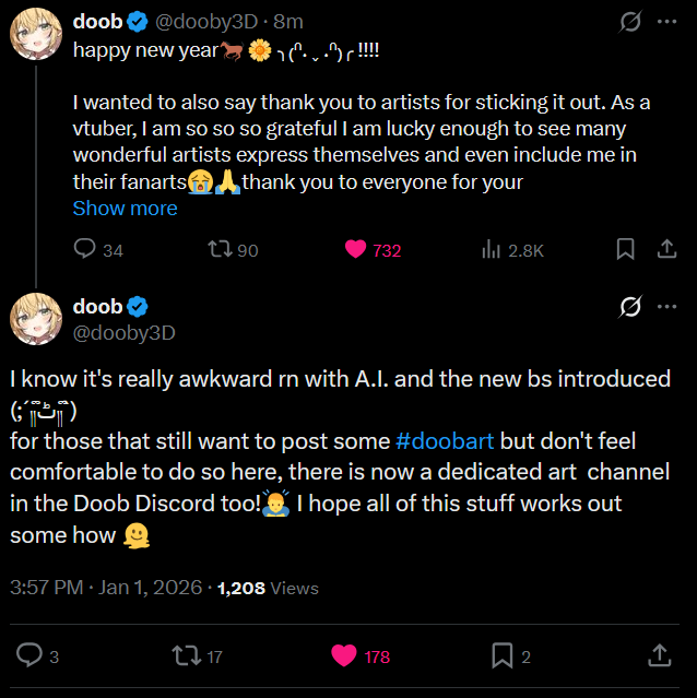 >>108240409Ame/dooby us actually somewhat pro-AI. She's kinda like larian's devs in that she just dislikes generative AI and when it replaces real jobs with sloppy, inferior versions.