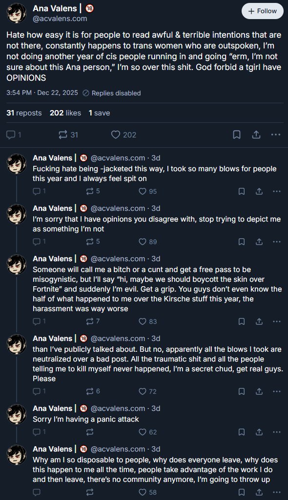 >>108241009>>108241176The 3 main freaks who tried to run the cancel campaign on Kirsche were Anal Violence, Bint and Nyara. All 3 are troons btw. Anal violence straight up showed screenshots of this board in her hit piece article of kirsche. Also, the freak who writes walls of seethe text wrote "she started a hate campaign" against ACValens, something only one of those 3 or his followers would say (pic related)