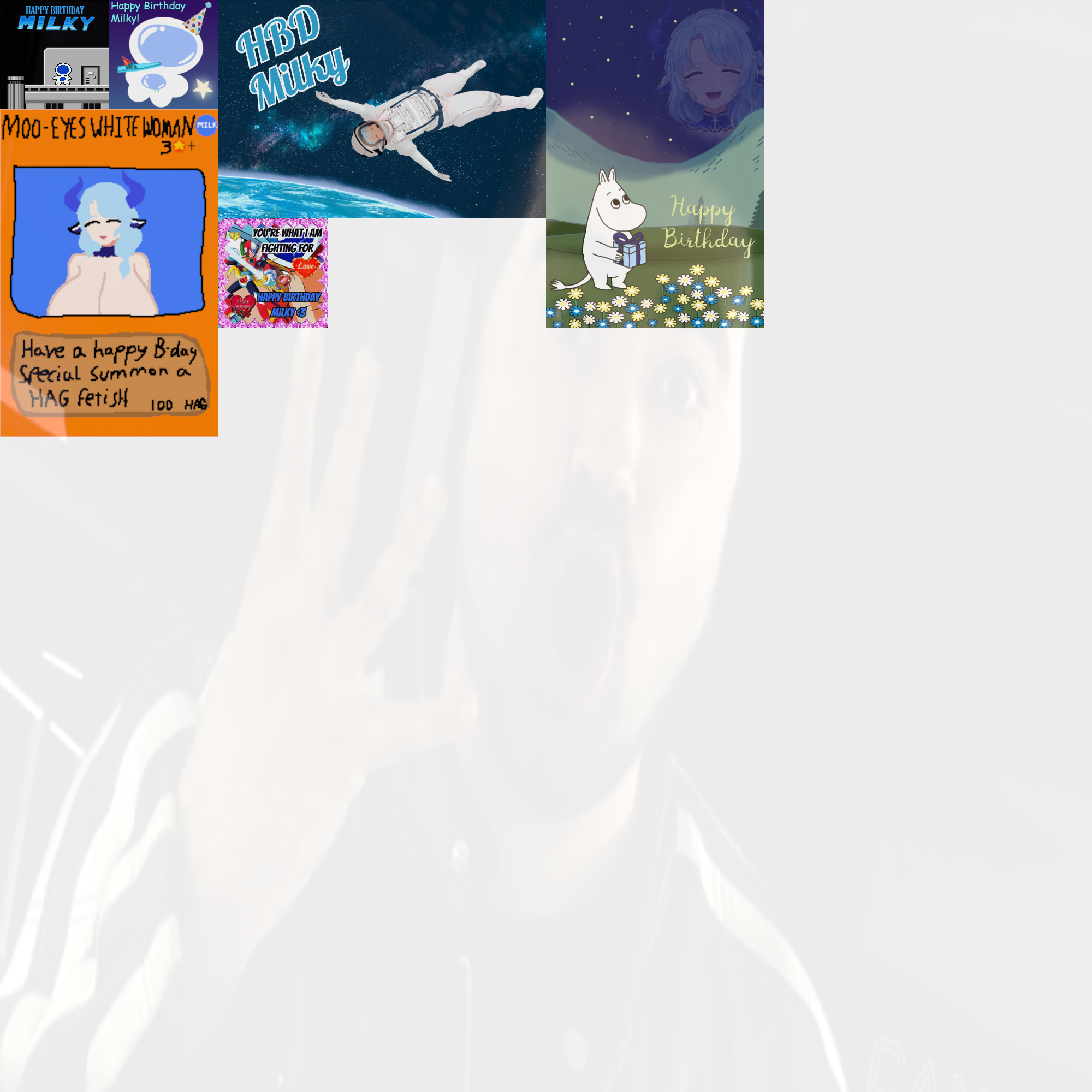 IN FOUR HOURS it will be Milky's birthday, so please feel free to add to her birthday card! Submissions must have image dimensions that are in multiples of 200 (I.E. 200x200, 400x200, 400x400, etc.), and all submissions must be SFW though you may refer to suitable related terms such as MILF, boobs, etc. but please do not include any explicit content/words.Some things for inspiration:>Loves cosmic/space, tarot, nature, baking, cottagecore and girly aesthetics>Enjoys clamp manga/anime such as Cardcaptor Sakura and Chobits, but also series like Digimon, Hunter X Hunter, Sailor moon, and Princess Tutu>Her iconic color is blue, but her favourite colours include seafoam green, mint, and lavender>favorite flower is Lavender, but also loves hydrangeas, tulips, and lily of the valley>Favorite games/series includes Sonic, Mega Man, Pop'n Music, and currently Infinity NikkiThe deadline for the card is January 2nd at midnight EST, that's 9pm January 1st for PST. Make sure you get your submissions in before thenModel References:https://drive.google.com/drive/u/0/folders/1lhBVhCa6dQZFDryMWB8jYFQNhgkwFDJE