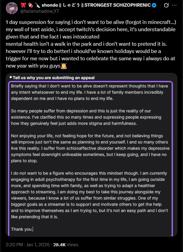 >>108241028do the twitch rules say anything about "intent" or do they just say don't be suicidal on stream