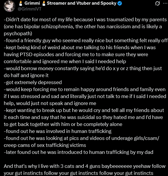 >>108242877>grimmi's dad was a child sex trafficker and he got grimmi's boyfriend into itlmao this has to be a joke