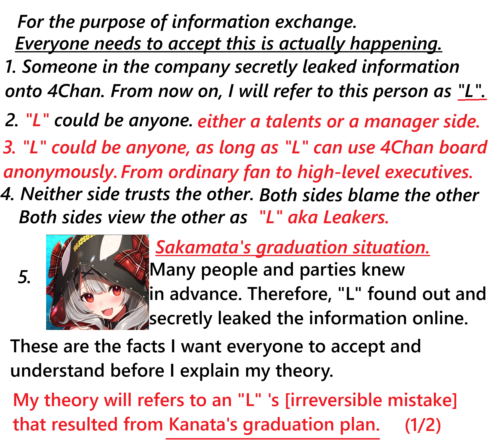This is the first part of my theory. I will explain how the outcome of Kanata's graduation plan caused irreparable damage to those "L" aka leakers in the next part.
