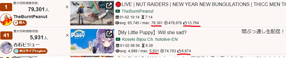 *PLATINUM TALLY 2026* (Vtuber Streams >100k)January 1. hololive new years afterparty (hololive/01-01)2. hololive gomoku narabe tournament (Miko/01-01)3. Sankisei 24 hours stream (Pekora/02-01)hololive: X32025 tally hololive: X73Nijisanji: X43