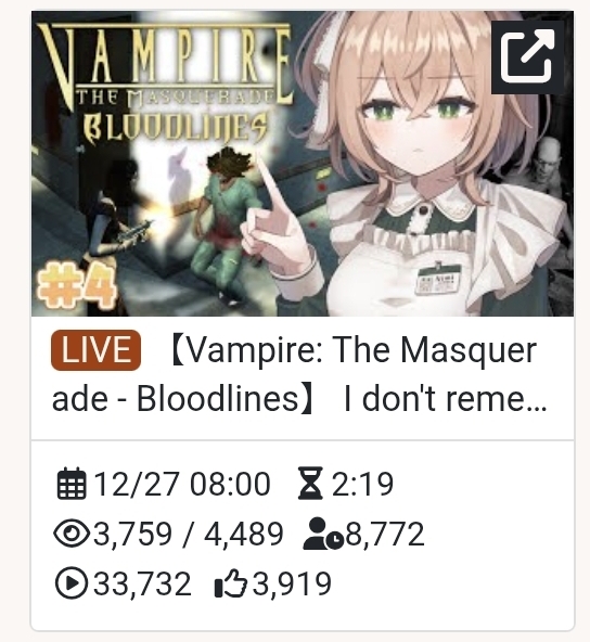 >>108252643Yeah that too, guess we're finally just seeing nimi's views without bots. Imagine if she was actually playing a debuff indie game or something instead of a hyped up megabuff end of the year event, might not have even hit 5k.