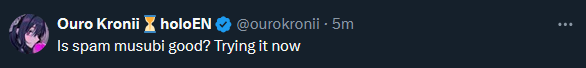 >>108355590If anyone else here is gonna try spam musubi because of Kronii: she's being polite. It's moreso okay than actually good. It's convenient if you are in a rush and need something to eat on your commute. It's also really good food when drinking, especially if it's handmade since salty + drunk = good.