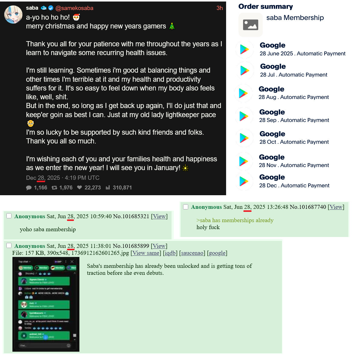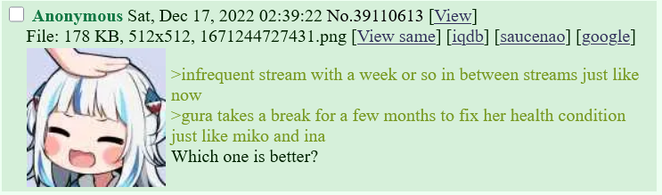 >>108293649>2026?Funny, but it's really curious that Saba did the same type of health break in late 2025 that Gura did in late 2022. There are definitely some hidden messages in what Saba is doing and Kronii with her multiple Kronii stream yesterday felt like a subtle hint. That she named it "New Year New Me (Literally)" was less subtle.