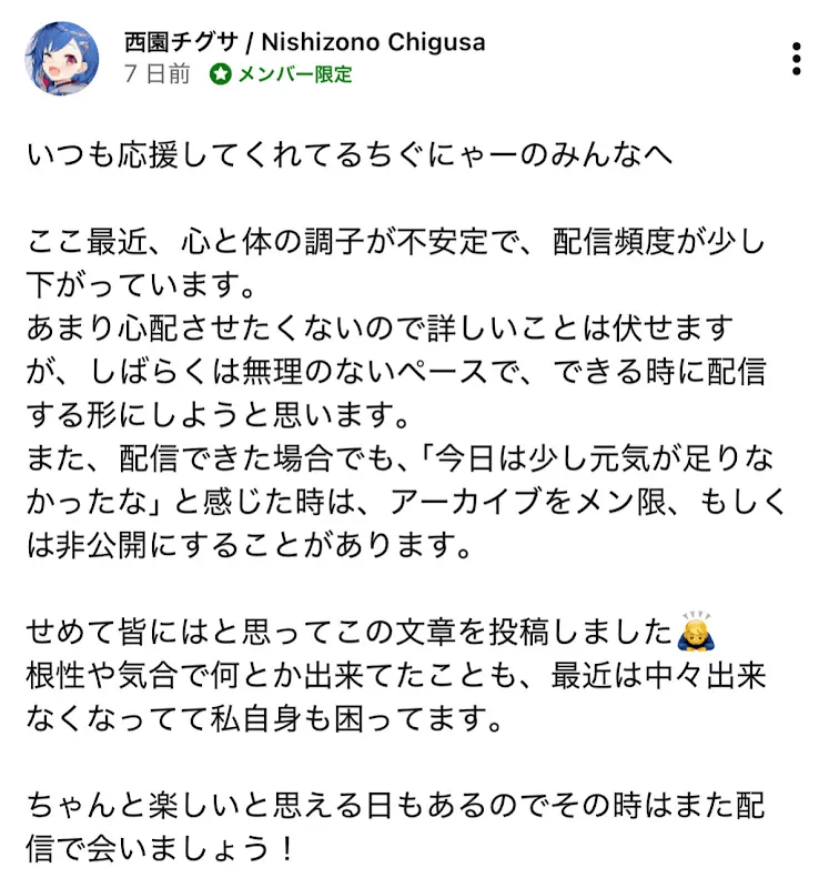 Chigusa had to go to the hospital.https://www.youtube.com/post/Ugkxy9DuQwpY7nKXlnjhz1vYFFm0nmeOdKOX