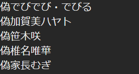 https://www.youtube.com/watch?v=RfybrIkMSQU (Kanae)https://www.youtube.com/watch?v=bBhr54XCdSo (Shiina)https://www.youtube.com/watch?v=vBDLJPyViRw (Akina)https://www.youtube.com/watch?v=OCCFP-OVdTA (Mikoto)https://www.youtube.com/watch?v=9xX5TWOimM4 (Hayase)https://www.twitch.tv/toru_2434