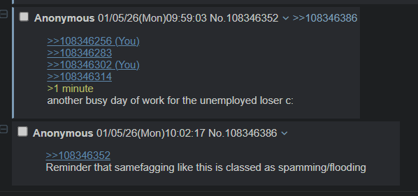 >>108346256>>108346283>>108346302>>108346314>1 minute another busy day of work for the unemployed loser c: