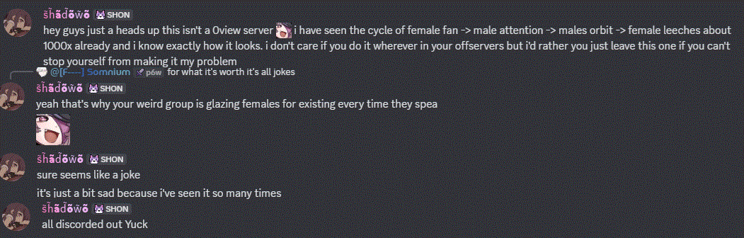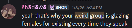 shondo's judge of character is flawless and is not emotionally manipulated when she ignores all of this for the 67th time, stop worrying about her chud, she can handle things like them isolating her from her friends and other good fans and causing constant problems for her and others and gaslighting her about it and being two faced whilst she has the 8th melty on stream and 11th in discord over it. you sound like one of those jealous cucks complaining about the bean server back in the day mad that shondo had fun with her biggest fan antis