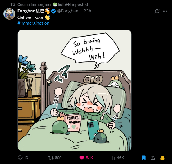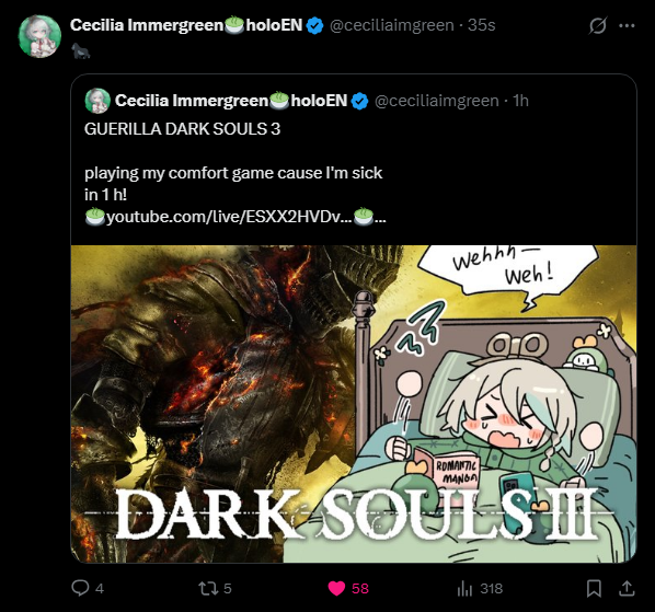 The 680th Wind>NEXT STREAM: PENDINGLink pending>LAST STREAM: Rambles while buried in blanket (super short mini space)https://x.com/ceciliaimgreen/status/2008309120584290605>Links:YouTube: https://www.youtube.com/@holoen_ceciliaimmergreenTwitter: https://twitter.com/ceciliaimgreenImportant Videos: https://rentry.org/ImmerMarks>Music:https://rentry.org/ImmerPiece【Hololive EN Justice】ABOVE BELOW- https://www.youtube.com/watch?v=ilLEj-SCCn8【Cover】 Forgotten Words | 忘れじの言の葉 #歌ってみた - https://www.youtube.com/watch?v=twto2g0FwTQ【Hololive EN】Odyssey - https://www.youtube.com/watch?v=0wO8d70KSXw【ENReco Orisong】Oh Princess - https://www.youtube.com/watch?v=5x9ix5CGmoo【CCGG Cover】Naimononedari / ないものねだり - https://www.youtube.com/watch?v=Qq-fgjrc-uc【CCGG Cover】Turing Love / チューリングラブ - https://www.youtube.com/watch?v=hX_3P0TBGP4【Hololive EN】 All for One - https://www.youtube.com/watch?v=ok24HgzbeLs【Hololive EN Justice】RENEGADE - https://www.youtube.com/watch?v=xg6DUmRRXlw【Cover】nevermore / ネヴァモア -https://www.youtube.com/watch?v=FZkkGB2bUyo【Original Song】Wind-Up - https://youtube.com/watch?v=Kqh6-vjars8>Merch:https://rentry.org/ImmerMerchHoloPro: https://shop.hololivepro.com/en/collections/ceciliaimmergreenGeekJack: https://shop.geekjack.net/pages/hololive>Tags:#ImmerScreen (Stream) https://twitter.com/hashtag/ImmerScreen#Immergination (Art) https://twitter.com/hashtag/Immergination#ImmerPiece (Music) https://twitter.com/hashtag/ImmerMusic#ImmerMemes (Memes) https://twitter.com/hashtag/ImmerMemes>/grün/ OP Template:https://rentry.org/ImmerTemplate>Previous Thread: >>108303643