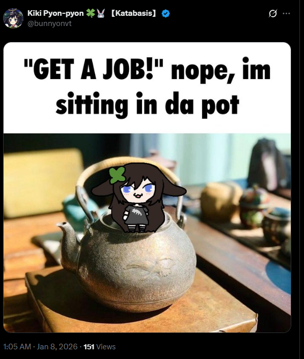 https://www.twitch.tv/kikipyonpyon/clip/WildManlySmoothieDeIlluminati-ZvKE1bNV3Vhyh8sM>GET A JOB!nope. I'm setting in da pot