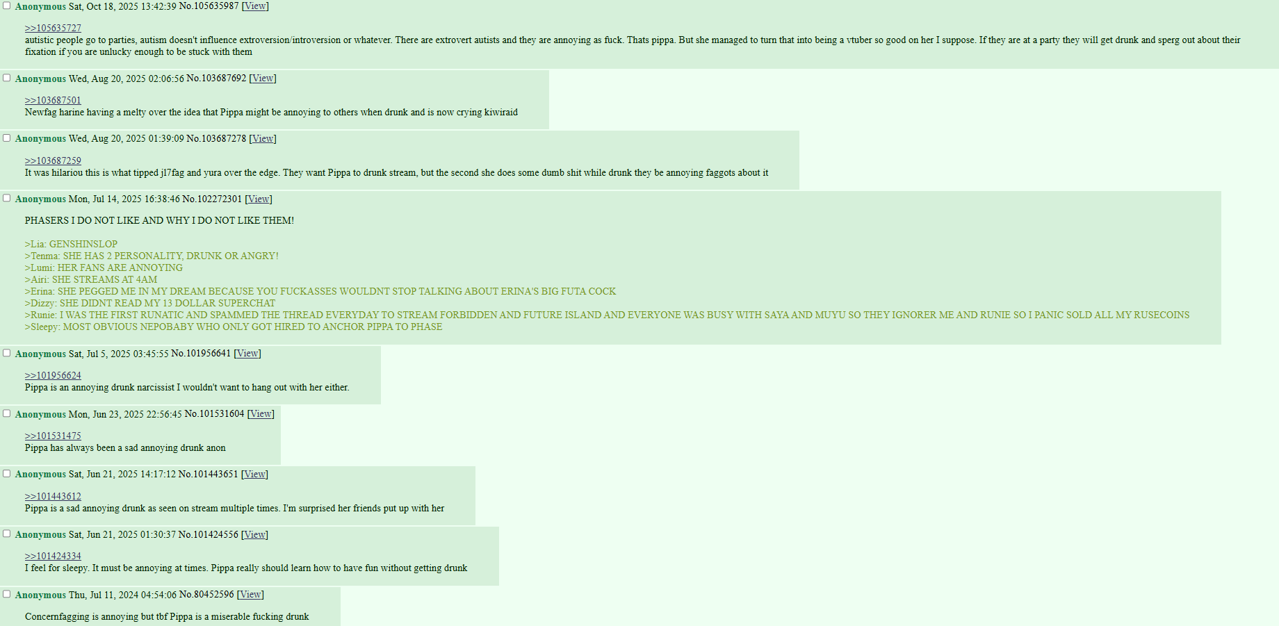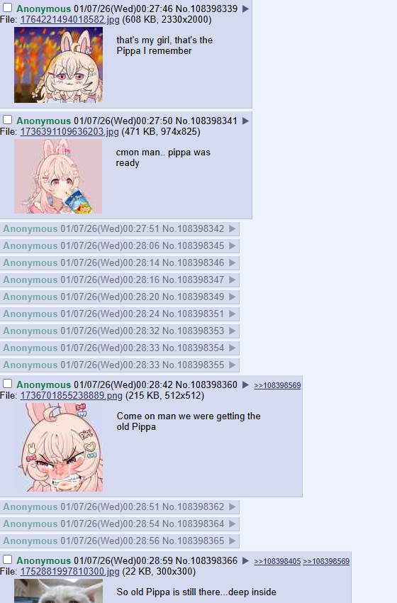 >>108401556Are you having a stroke, anon?Also people still live post about pippa all the time, pcg is extremely bipolar about her in particular. People will literally wish she died or graduated but when she goes online they go "omg beeba xDDD"