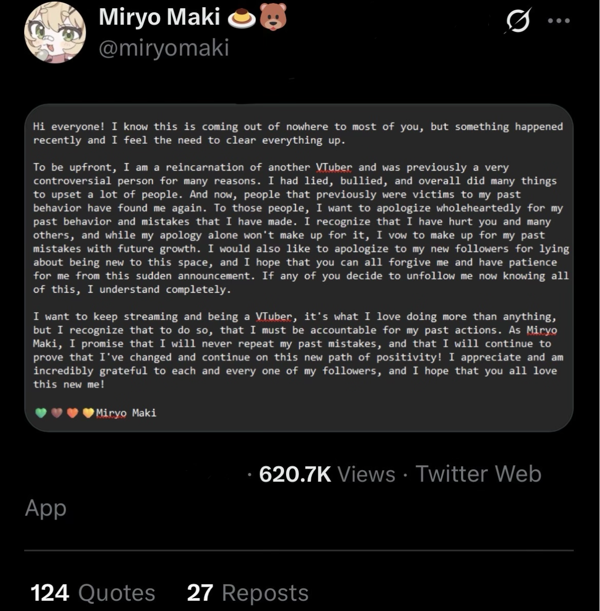 She's going to pull a Nekomata, AKA make new identity, donothon grift, quit, make new character etc...