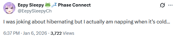 >>108423310She said on twitter that she sleeps more often due to the cold, which I believe. Same shit happens to me, and my room is frigid.