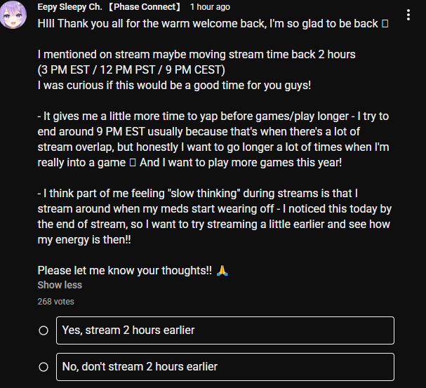 >>108426463From what that sounds she as more she's doing during the day. She used to always pop her meds right before stream which gave her 8 hours of energy, so either she's busy during the mornings now. Or like I guessed off her meds because of a bun in the oven